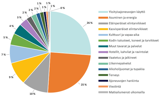 Vaikka joidenkin kulutushyödykeryhmien hiilijalanjäljen prosentuaalinen muutos oli suuri, kotitalouksien hiilijalanjäljen jakautuminen eri kulutushyödykeryhmiin noudatteli pitkälti aiempien vuosien rakennetta. Yksityisajoneuvojen käyttö sekä asuminen ja energia muodostivat kumpikin noin neljäsosan hiilijalanjäljestä, ja elintarvikkeet noin viidesosan. Loput 29 prosenttia muodostuivat muusta tavaroiden ja palvelujen kulutuksesta.