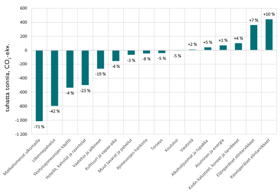 Yhteiskunnan sulkutoimet ja kodeissa vietetty aika heijastuivat majoitus- ja ravitsemuspalveluiden hiilijalanjälkeen, joka pieneni noin 500 000 CO2-ekv. tonnia. Myös vaatteita ja jalkineita hankittiin vähemmän, mikä pudotti päästöjä noin 260 000 CO2-ekv. tonnia.