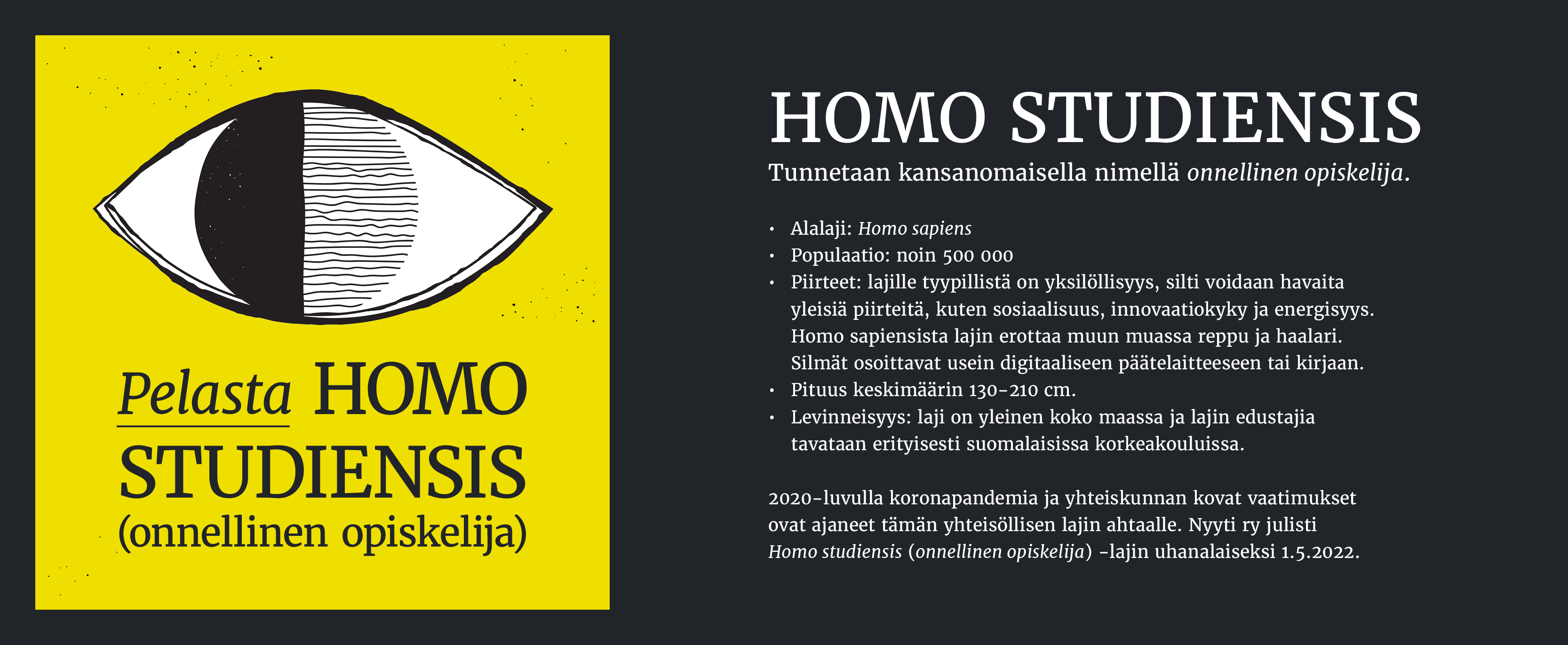 Opiskelijoiden jaksaminen on hätätilassa: Homo studiensis (onnellinen opiskelija) julistetaan uhanalaiseksi lajiksi 1.5.2022