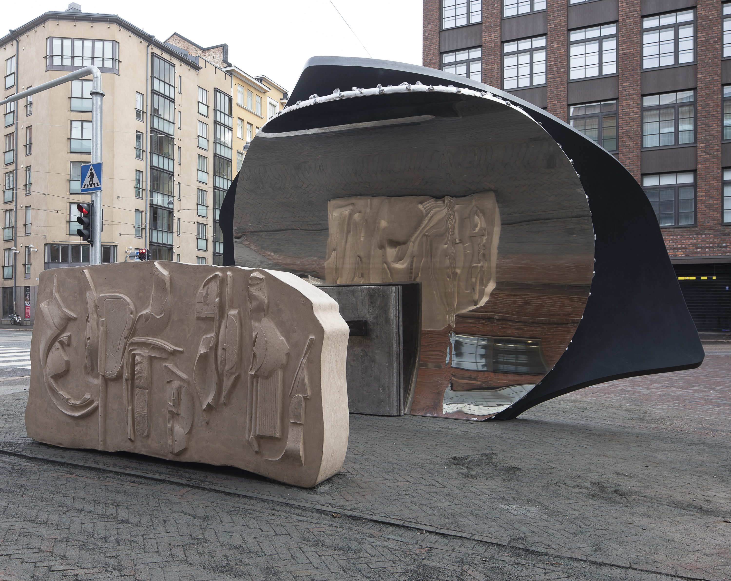 The materials of the sculpture have different characteristics. Where acid-resistant steel lasts for centuries in varying weather conditions, the shine of aluminium becomes cloudy over time due to the effect of a surface layer of oxides that protects the lower layers from corrosion, and the patina of bronze keeps gradually changing. Concrete lets its surroundings breathe through it. The sculpture appears different at different times of the year and in different light. The shiny steel surface reflects the ECHA building and the daily life of the area with people passing by. At the same time, the work reflects itself as its parts are mirrored by the shiny surface, creating an internal world of lights and reflections in the work.
