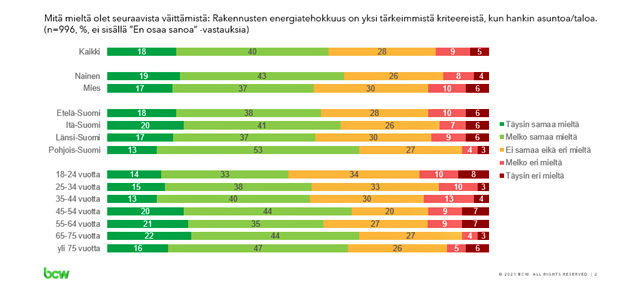 Pohjois-Suomessa asuvat suomalaiset pitävät muihin suomalaisiin verrattuna energiatehokkuutta tärkeämpänä kriteerinä uuden asunnon tai talon ostossa. Pohjoissuomalaisista jopa 66 prosenttia pitää energiatehokkuutta tärkeänä kriteerinä, kun vastaava luku on esimerkiksi länsisuomalaisten keskuudessa vain 55 prosenttia.