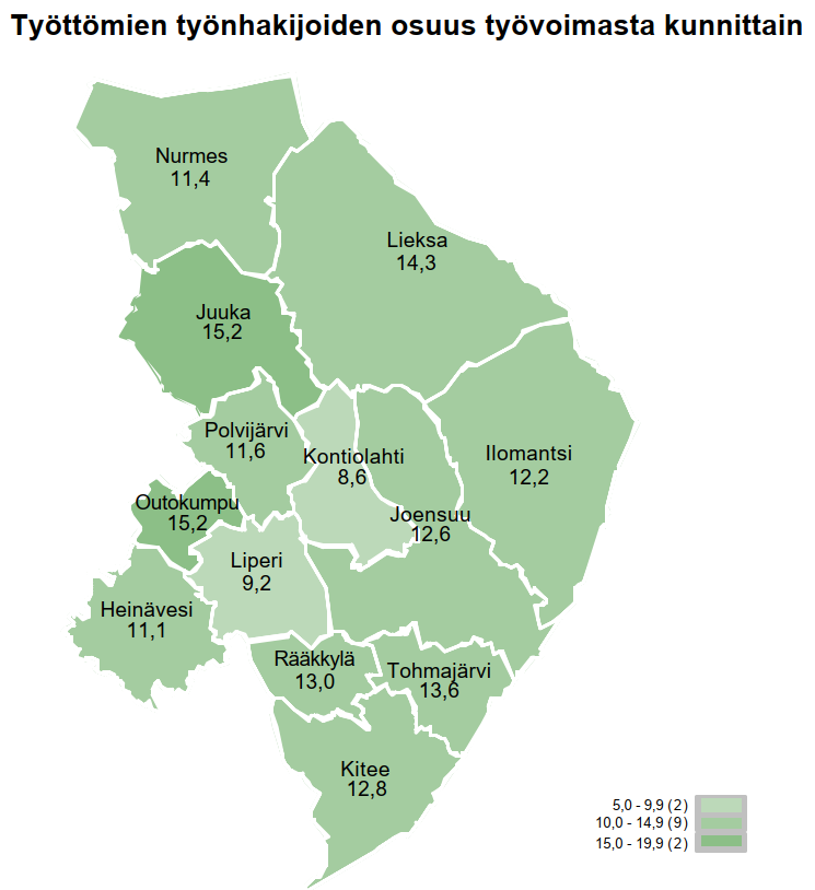 Työttömien työnhakijoiden osuus työvoimasta (71 466 henkilöä) oli 12,1 %. Vuosi sitten työttömien osuus työvoimasta oli 12,7 %.