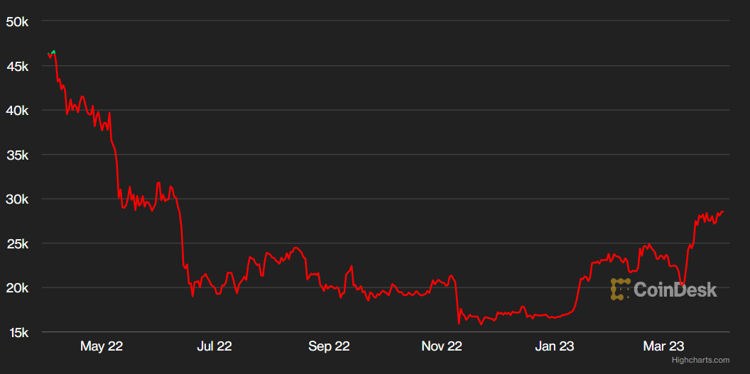 Arvon nousuun vaikutti merkittävästi Yhdysvaltain pankkisektorin vapina. Uutiset alkoivat Silicon Valley Bankista Kaliforniasta ja levisivät muihin pankkeihin. Viimeisen kuukauden aikana bitcoinin hinta on kasvanut yli 16 prosenttia.