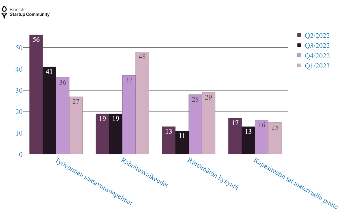 Barometrissa selvitetään myös startup-yritysten keskeisimmät kasvun esteet. Vuonna 2022 osaavan työvoiman saatavuus oli ylivoimaisesti merkittävin kasvun este. Tilanne on kuitenkin muuttunut viimeisimpien lukujen valossa. Osaavan työvoiman saatavuusongelmat eivät enää ole keskeisin kasvun este juuri tällä hetkellä ja tilalle on tullut rahoitus ja talousvaikeudet.