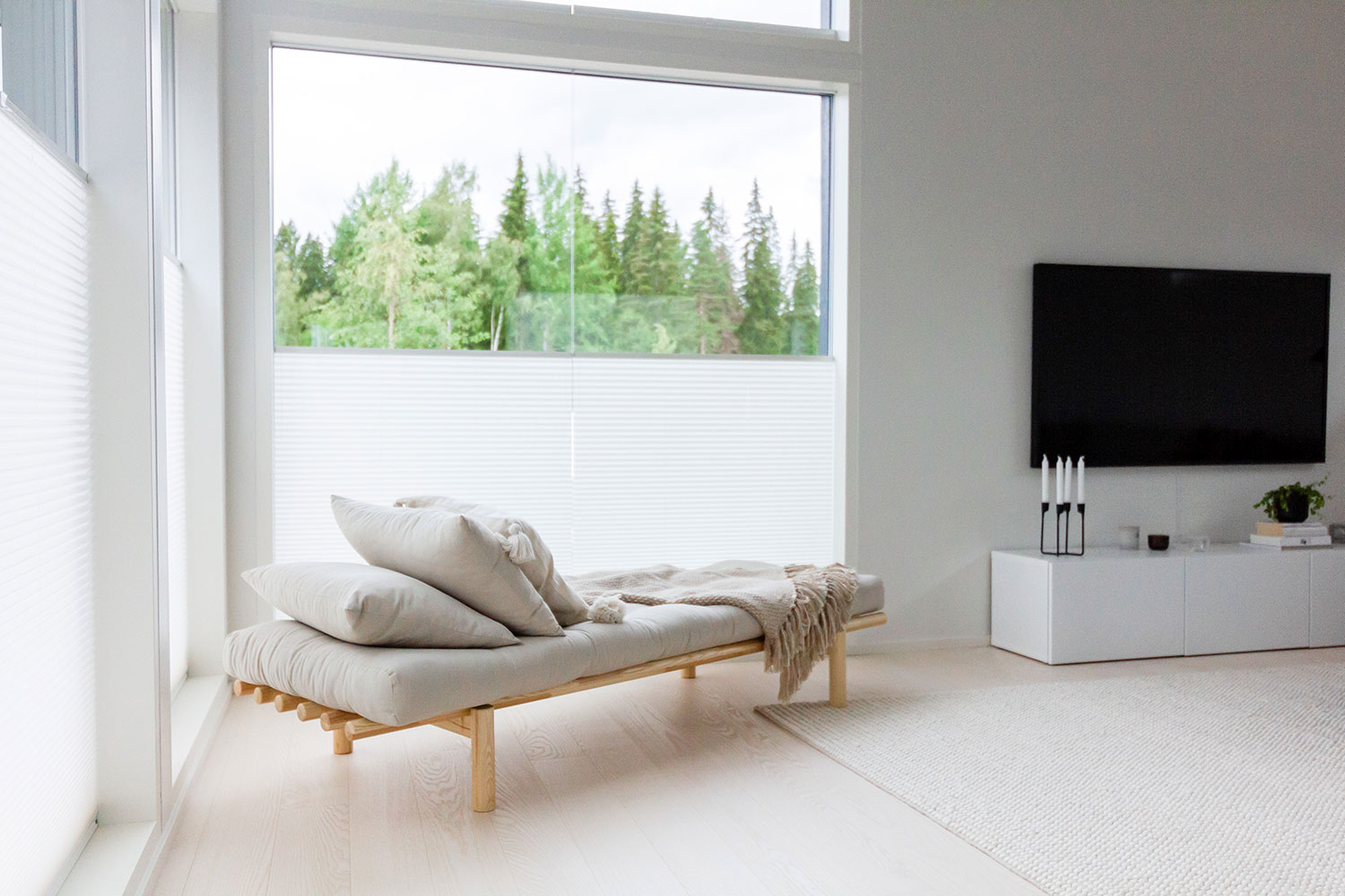 Lasipintojen koossa ei ole kohteessa säästelty, vaan makuuhuoneisiin ja oleskelutiloihin on jokaiseen valittu suuret ikkunat merellisen maiseman tuomiseksi osaksi sisustusta. Suuret ikkunat tuovat luonnonvalon tehokkaasti sisätiloihin ja varmistavat, että ympäröivistä upeista merellisistä maisemista voi nauttia huonommallakin säällä ikkunoiden kautta. Musta väri jatkaa suosittuna uudisrakentamisen trendinä ja Lilla Hyggen kaikki ikkunat ja ovet ovatkin valittu värimaailmaltaan mustaksi yksityiskohtia myöten. Mustat ikkunat ja ovet tuovat kontrastia talon vaaleaan julkisivuun ja ryhtiä sisustukseen.