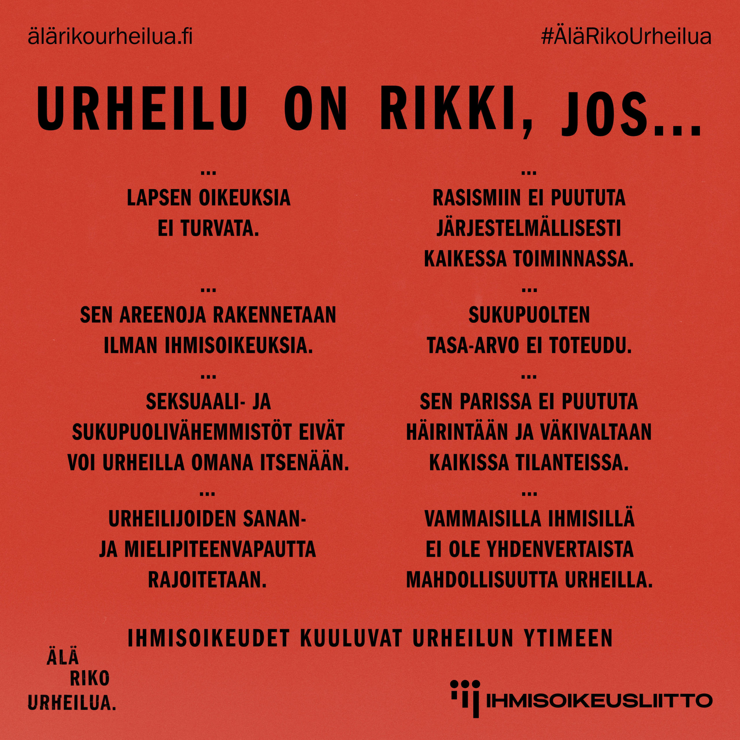 Ihmisoikeusliitto tuo yleisurheilun Suomi-Ruotsi-maaotteluviikonloppuna esille urheilun ihmisoikeuskysymyksiä. Kutsuvieraista koostuva Älä riko urheilua -tiimi kisaa maaottelun yhteydessä järjestettävässä Ruotsi-ottelu 10-tapahtumassa. Tapahtumaan osallistumalla Ihmisoikeusliitto haluaa nostaa esiin viranomaisten ja urheilun päättäjien vastuuta ihmisoikeuksien toteutumisesta urheilussa.