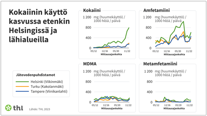 Amfetamiinia käytetään edelleen merkittäviä määriä koko Suomessa. Sen käyttö on pysynyt selvästi alle vuoden 2020 ennätyksellisen tason, joskin kasvanut jälleen hieman suurissa kaupungeissa alkuvuonna 2023 verrattuna vuoteen 2022. Kokaiinia puolestaan käytetään koko ajan enemmän etenkin pääkaupunkiseudulla.