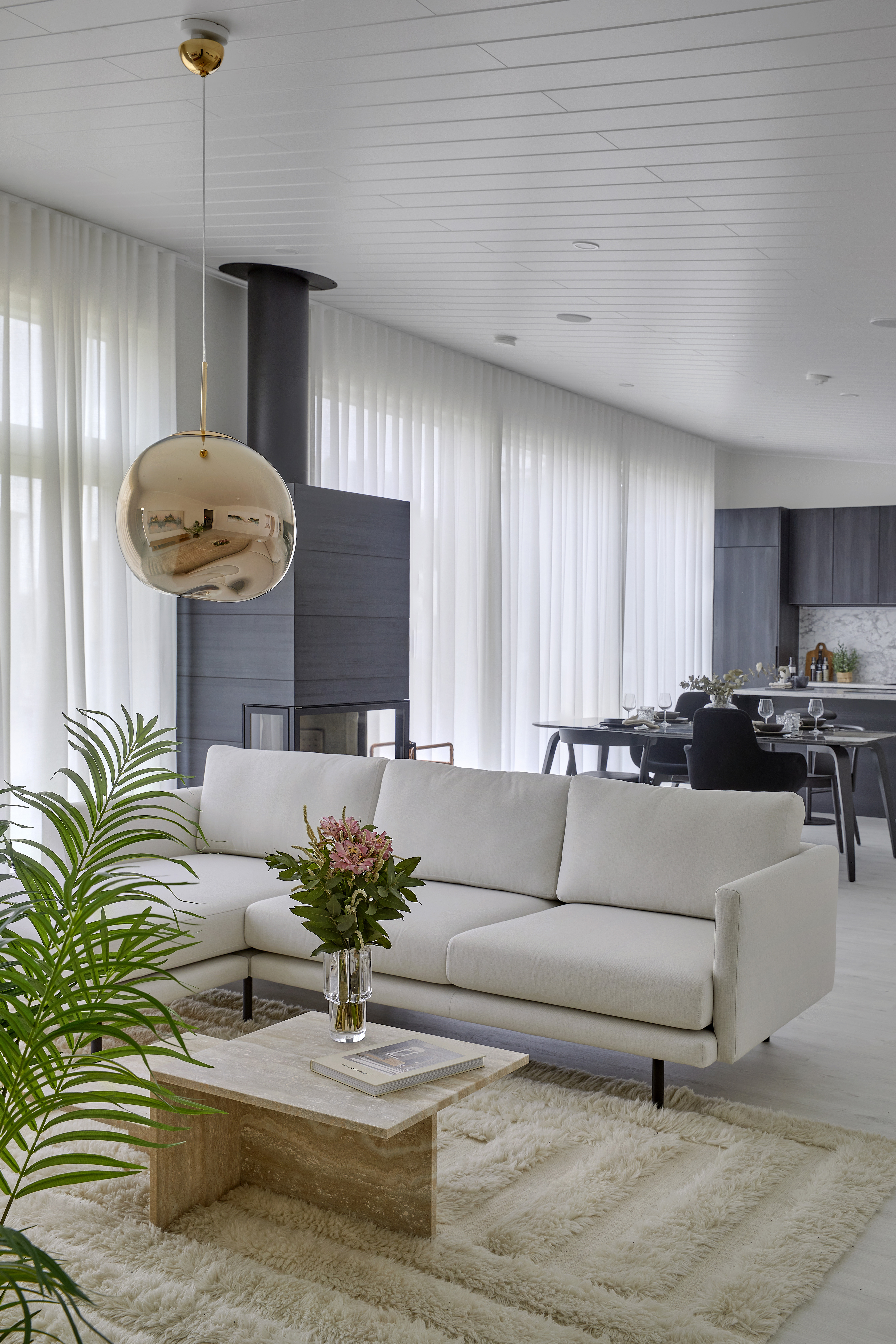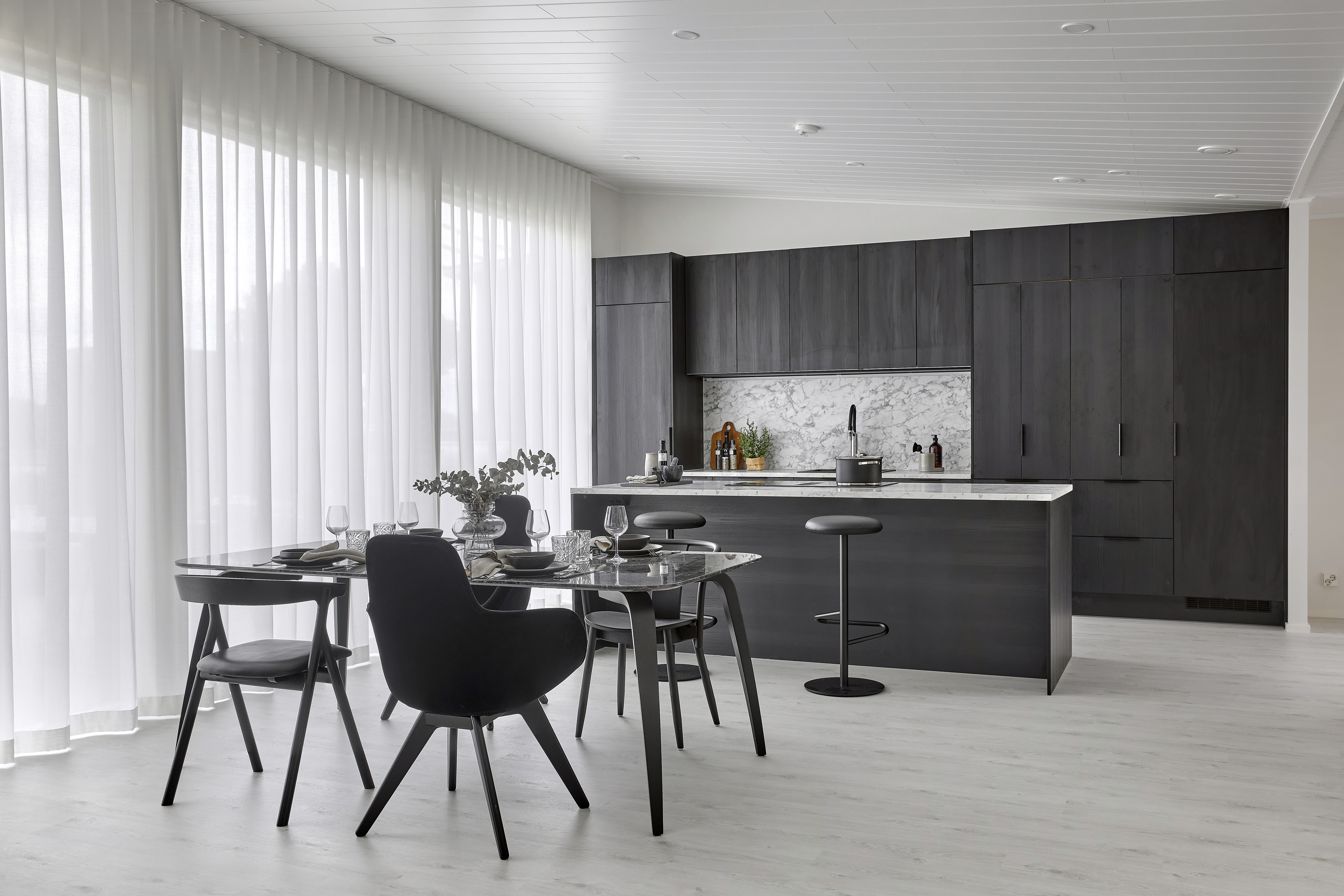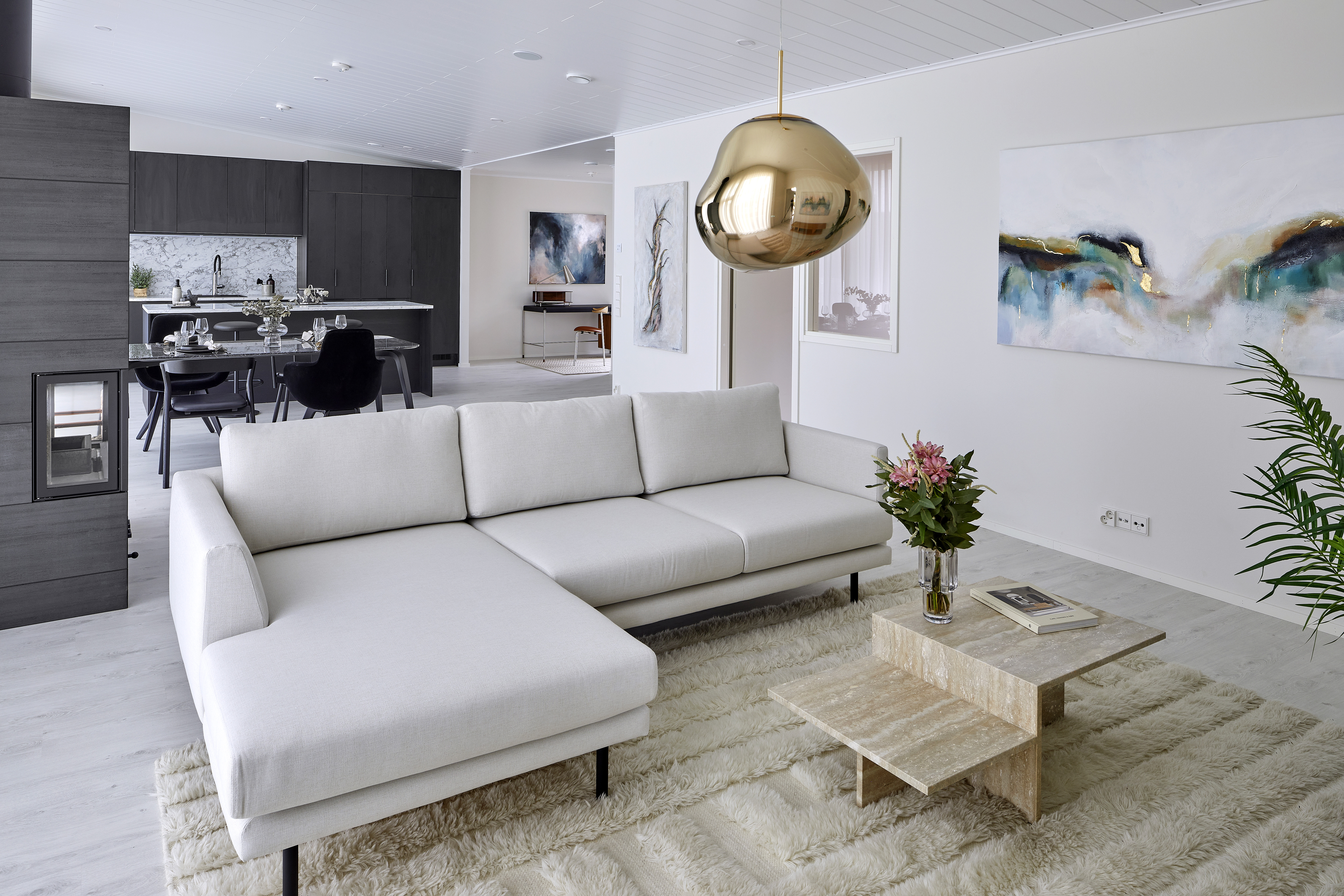 120-neliöiseen taloon mahtuu viisi huonetta ja keittiö, mutta Ryynäset ovat yhdistäneet kaksi vierekkäistä makuuhuonetta yhdeksi isoksi huoneeksi 12-vuotiaalle Albin-pojalle sekä jättäneet yhdestä makuuhuoneesta väliseinän pois, jolloin perheen isälle saatiin avoin työtila oleskelutilojen yhteyteen. Väliseinät ovat helposti palautettavissa, jos nykyisten tai tulevien asukkaiden tarpeet muuttuvat.