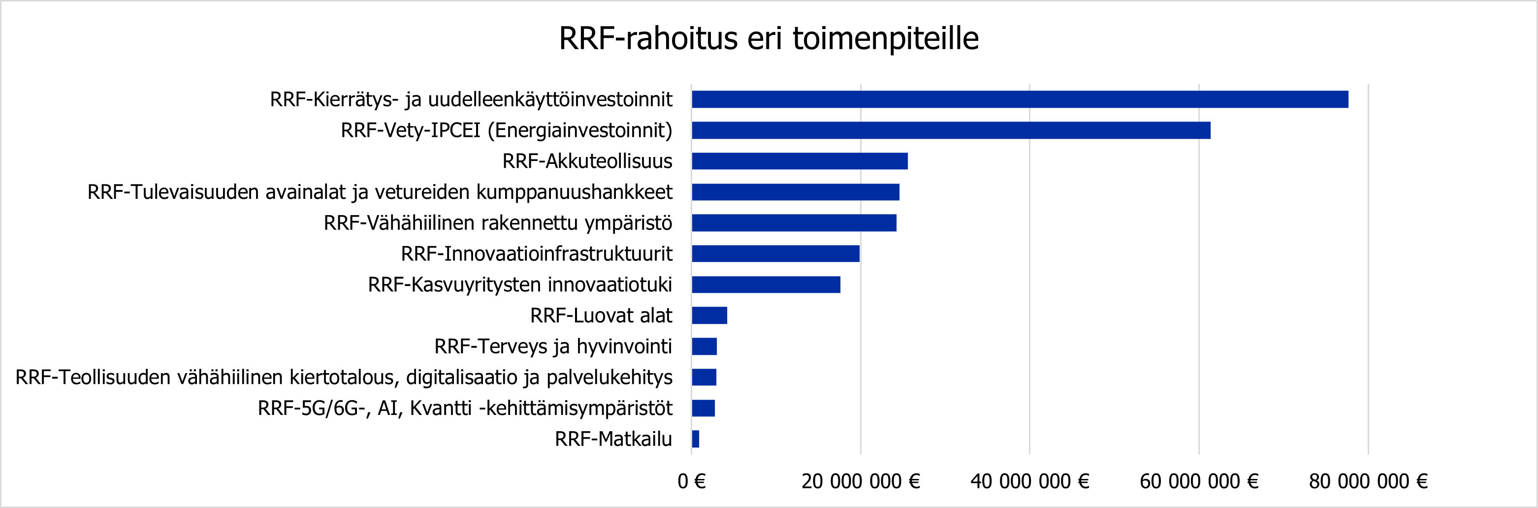 RRF-rahoitusta saaneet toimialat ovat esimerkiksi ICT, akkuteollisuus, energiainvestoinnit, kierrätys ja materiaalien uudelleenkäyttö, vähähiilinen rakennettu ympäristö, terveys ja hyvinvointi, luovat alat sekä kestävä matkailu.