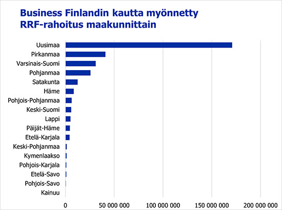 Suomessa alueellisesti RRF-rahoitus on kohdistunut sinne, missä yrityksiä on eniten. Uusimaa, Pirkanmaa ja Varsinais-Suomi ovat listan kärjessä, mutta RRF-rahoitusta on saatu kaikkiin Suomen maakuntiin.