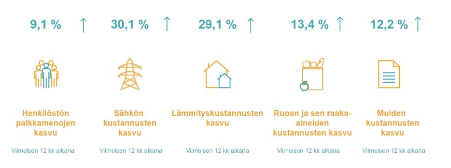 Kyselyn tuloksista käy ilmi, että kustannukset ovat nousseet keskimäärin 18,8 prosenttia ympärivuorokautiselle palveluasumiselle tyypillisissä kustannusluokissa viimeisen 12 kuukauden aikana. (Katso liitteenä oleva kuva, jossa eri kustannusluokat on eritelty.)