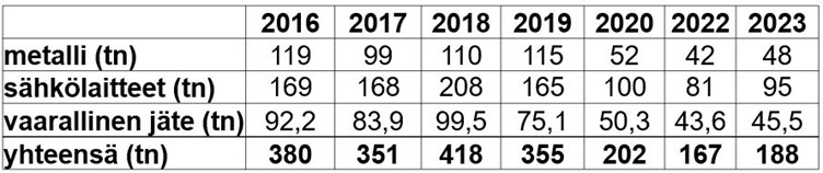 Vaikka nousua on viime vuoteen verrattuna selvästi, jäätiin huomattavan kauas aikaisempien vuosien luvuista. Vuonna 2018 sähkölaitteita kertyi autojen lavalle 208 tuhatta kiloa ja metalliromua 110 tuhatta kiloa.