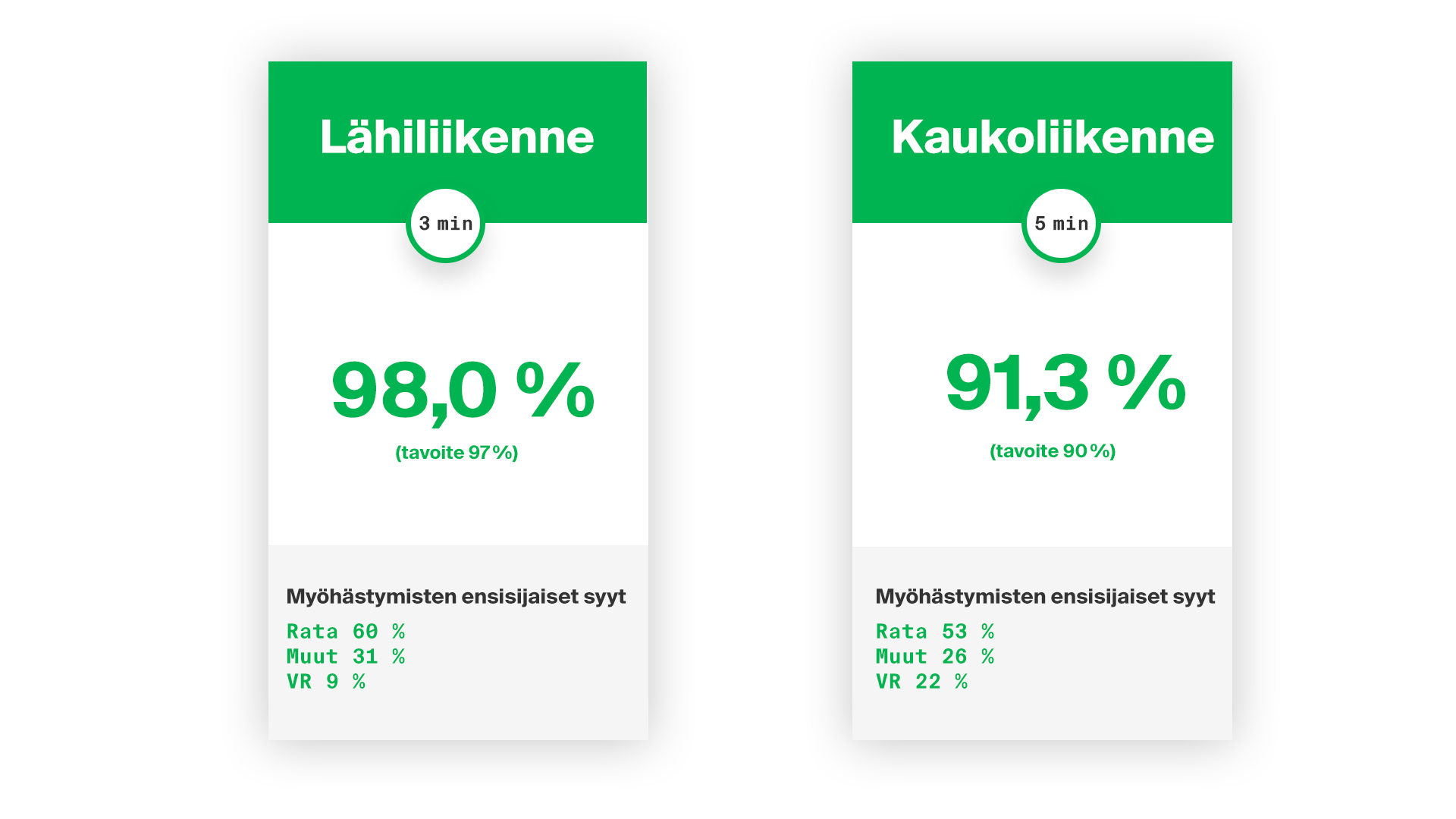 VR:n lähiliikenteessä heinäkuun täsmällisyys oli 98 %. Myöhästymisen syyt jakautuivat radasta johtuviin syihin (60 %), muihin syihin (31 %) ja VR-syihin (9 %).