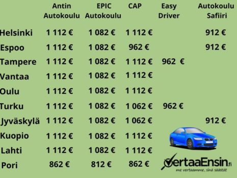 VertaaEnsin.fi vertaili Suomen viiden isoimman autokoulun hinnat kuntakohtaisesti ja selvitti, kuinka paljon hintaeroa on opetusluvalla ja autokoulusta hankitun ajokortin välillä. Lue lisää ja katso kuntakohtaiset autokouluhinnat suoraan selvityksestä: https://www.vertaaensin.fi/blog/ajokortin-hinta