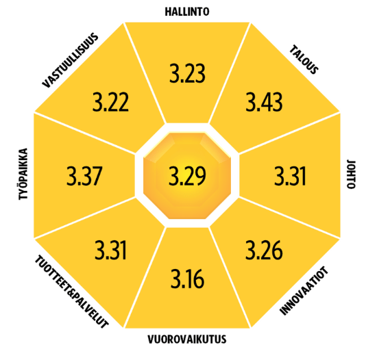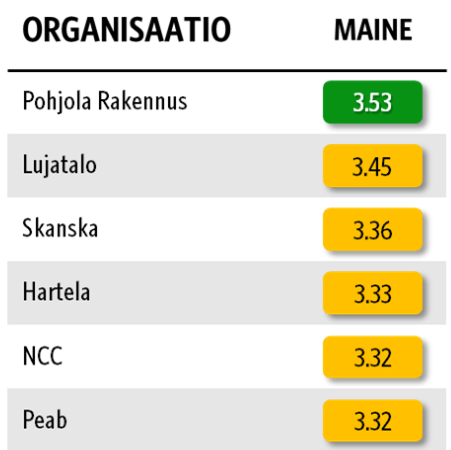 T-Media on seurannut rakennusalan yritysten mainetta vuodesta 2018 lähtien: rakennusalan yritysten keskimääräinen maine on kohtalaisella tasolla. Tämän vuoden tutkimuksessa yritykset saivat keskimäärin parhaan arvosanan taloudesta (3.43) ja työnantajuudesta (3.37).