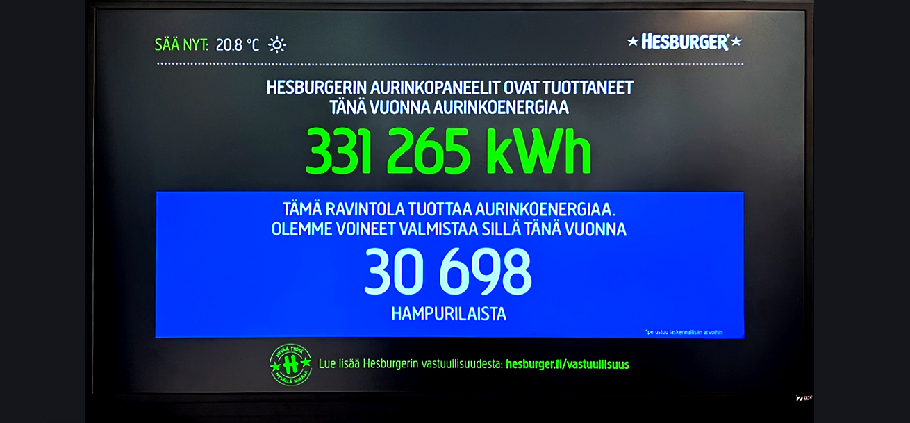 Aurinkopaneelien sähköntuotantoa voi seurata reaaliajassa Hesburgerin verkkosivuilla(www.hesburger.fi) tai aurinkosähköä tuottavien ravintoloiden asiakastiloissa sijaitsevilta näytöiltä.