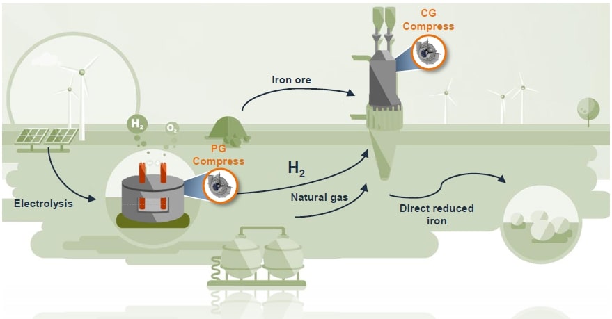 The gear units are developed and built at the RENK site in Winterthur, Switzerland. They are used in a direct reduction plant in Siemens compressors. In direct reduction, iron ore is converted into sponge iron with the help of a reducing agent. In the process, the reducing gas dissolves the oxygen out of the iron ore without it melting. This process takes place in the direct reduction plant at overpressure and at about 1,050 °C. The iron ore is reduced to sponge iron. Instead of CO2, this technology produces water, which in turn is reused in the integrated process. In a direct reduction plant, both natural gas and hydrogen can be used flexibly as reducing agents. In this way, the natural gas content is gradually reduced and finally completely replaced by hydrogen.