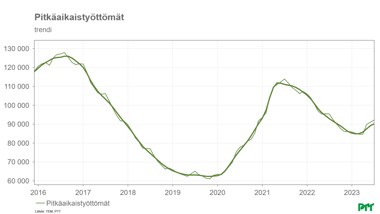 ”Käänne voi olla tulossa syksyn aikana. Työttömyys on noussut alkuvuodesta lähtien, ja pitkäaikaistyöttömien korkea määrä ja sen nousu edelleen huolestuttaa. Myös työikäisten osallistumisaste on laskenut, mikä yleensä voi kertoa siitä, että ihmiset kokevat tilanteen heikentyneen, jolloin siirrytään työvoiman ulkopuolelle eikä aktiivisesti etsitä töitä”, Busk sanoo.