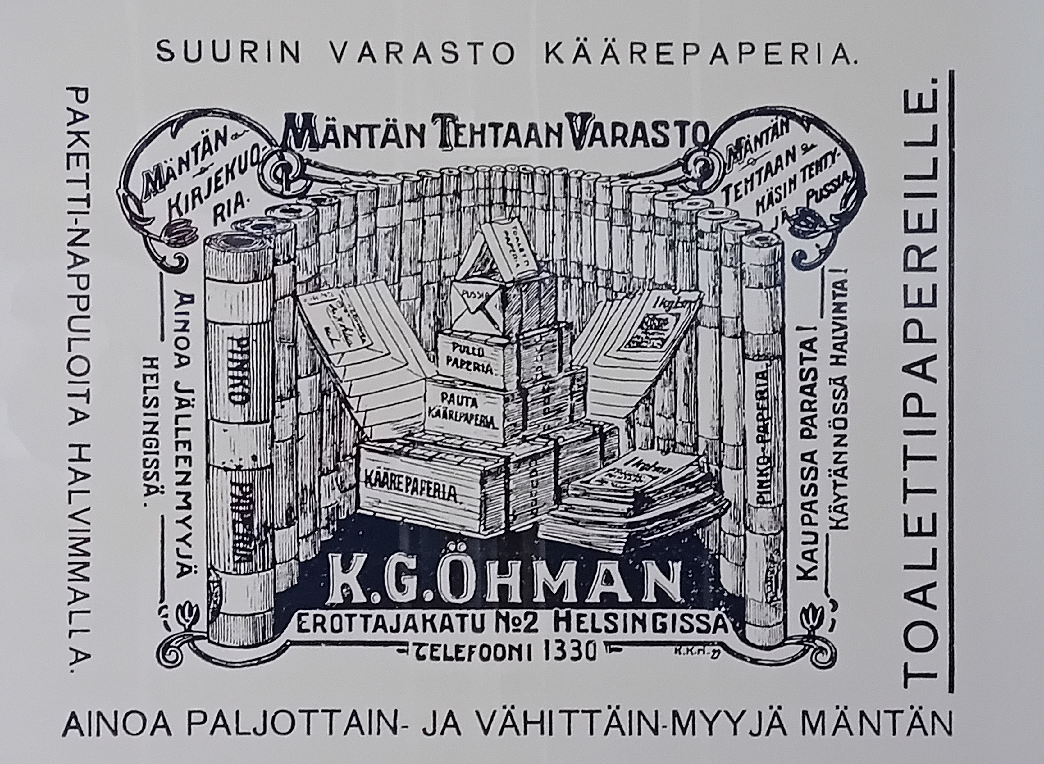 Yhtiömuoto oli tuolloin toiminimi. Tavaravalikoimaan kuuluivat maakauppiaitten tapaan mm. mausteet, terva, tupakka ja punamulta.Seuraavana vuonna yritys muutti Helsinkiin Erottajankadulle. Yritys siirtyi tämän jälkeen vähitellen paperin ja -pussien myyntiin.