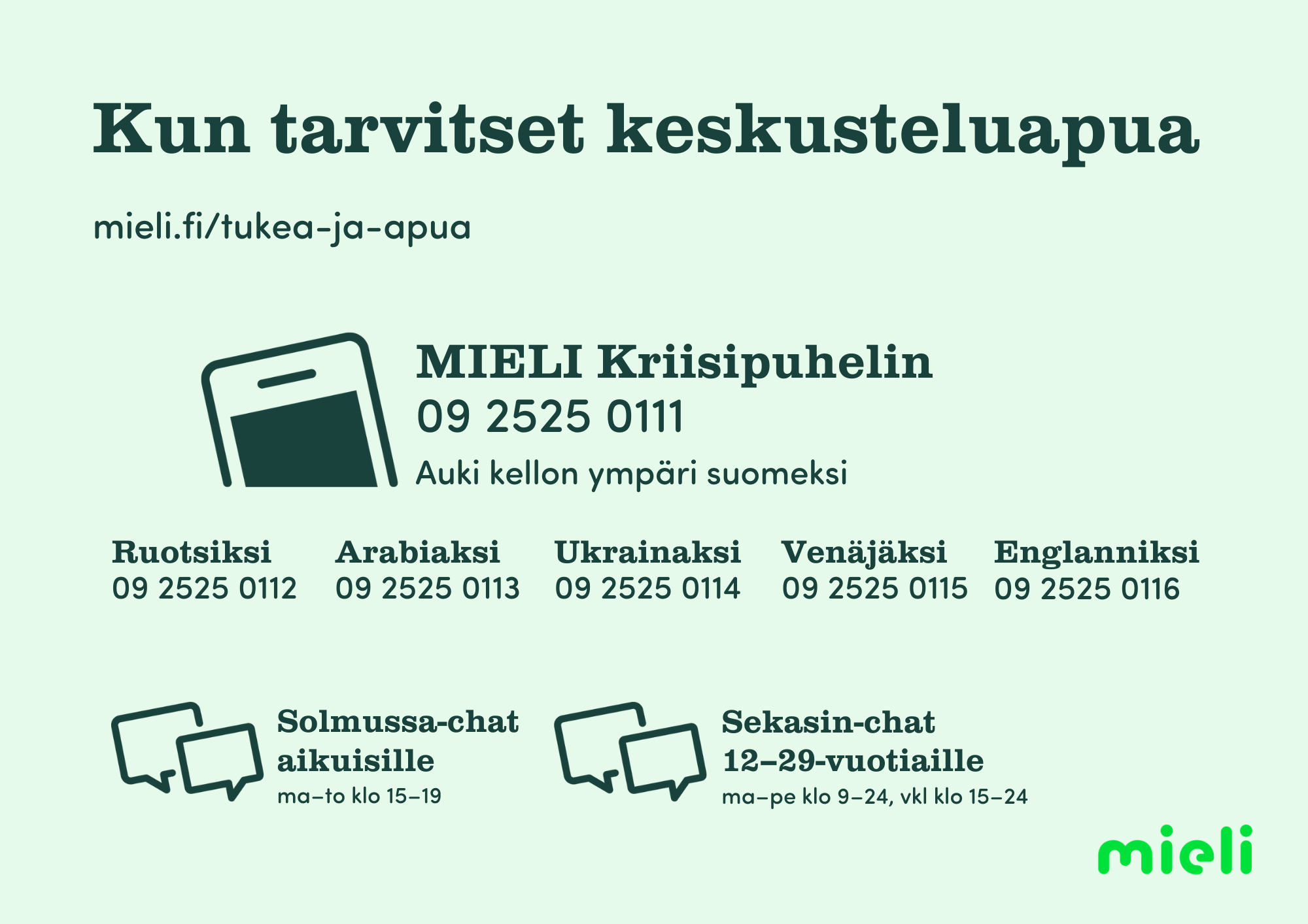 - Kriisipuhelin päivystää suomeksi 24/7 numerossa 09 2525 0111.