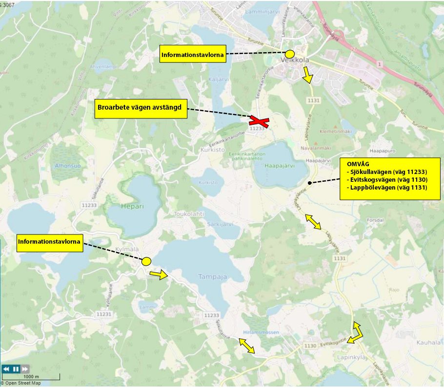 Trafiken dirigeras till en omväg via Sjökullavägen (väg 11233), Evitskogsvägen (väg 1130) och Lappbölevägen (väg 1131). Omvägen är cirka 15,8 km lång.