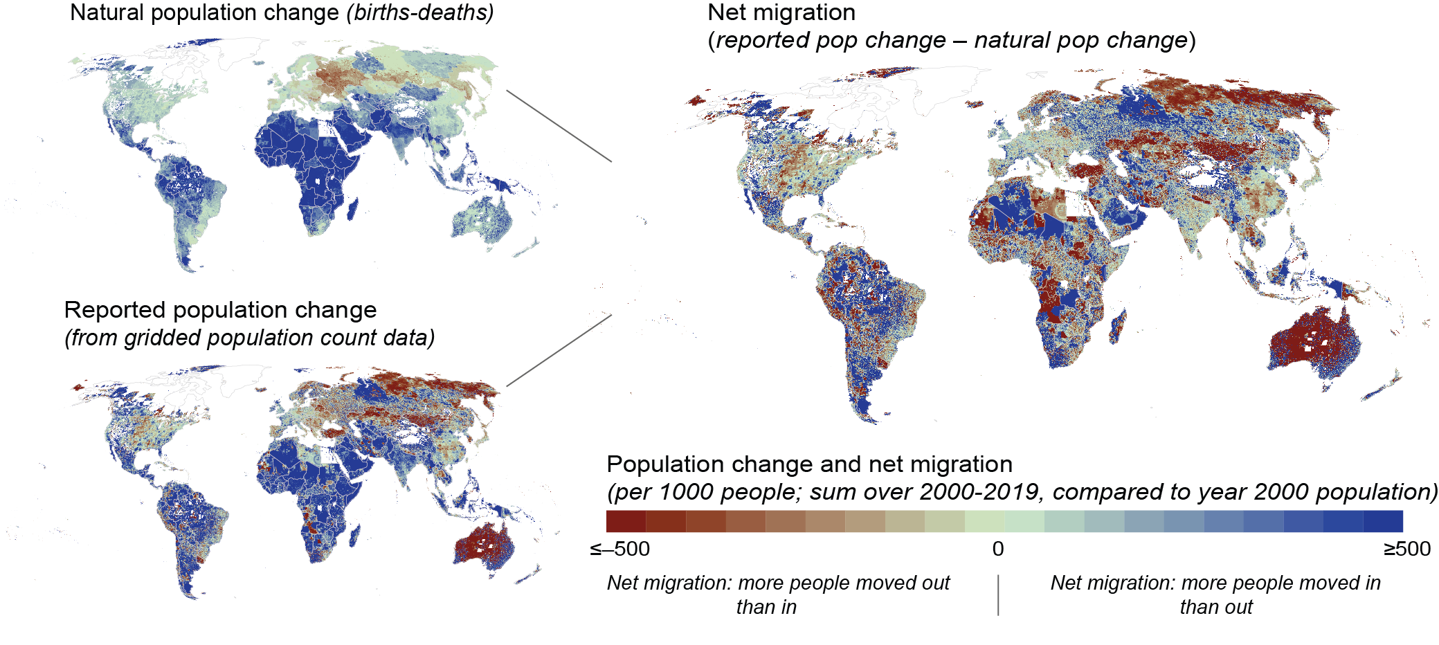 Aalto-yliopiston tutkijoiden vetämä ryhmä on nyt analysoinut ihmisten muuttoliikettä vuosina 2000–2019 rajaamalla globaalin kartta-aineiston noin sadan neliökilometrin kokoisiin ruudukoihin, ja vertaamalla alueiden syntyvyys- ja kuolleisuuslukuja kokonaisväestönkasvuun muuttoliikkeen hahmottamiseksi. Laaja tietoaineisto paljastaa ihmisten liikkumisen monimutkaisuuden, joka jää piiloon, jos keskitytään vain maiden väliseen muuttoliikkeeseen – suurin osa muuttoliikkeestä tapahtuu maiden sisällä.