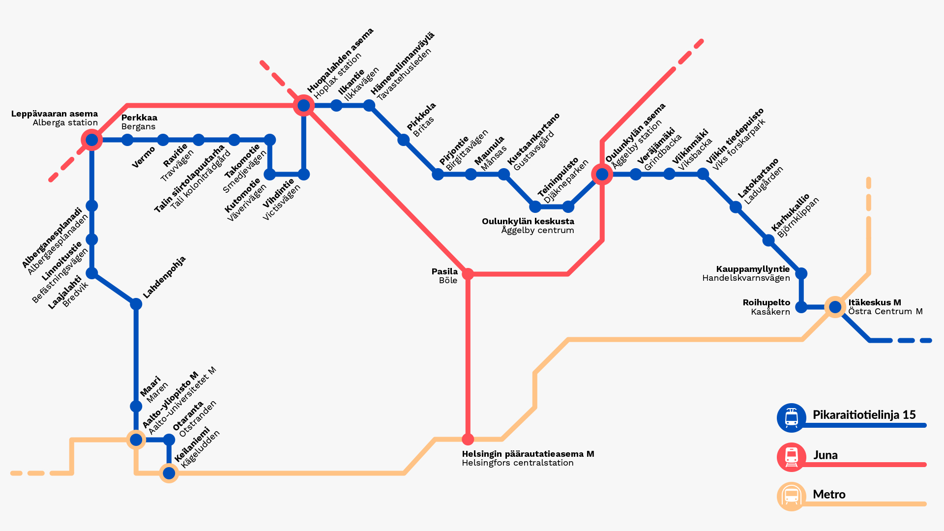 In Otaniemi and Keilaniemi, the light rail line is linked to the metro. In Leppävaara, the light rail line is linked to the City Rail Link and its future extension as well as the long-distance railway network.