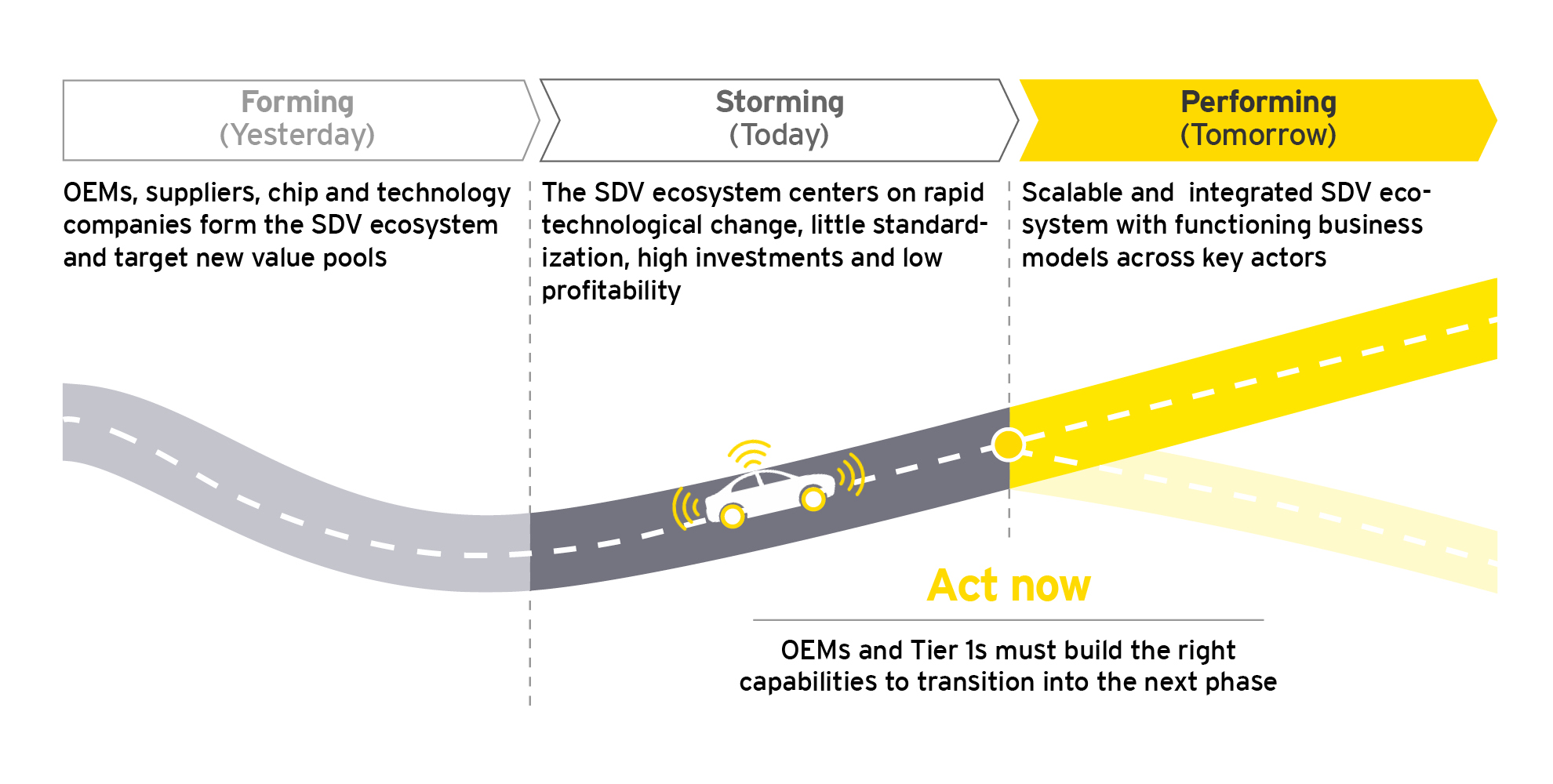 EY estimates that the average investment required per OEM for SDV programs will be between one and five billion US dollars. New collaborations should make existing capabilities scalable and profitable. Companies should review their partnerships and focus them more on commercial success. Transformation programs must also be set up to answer important questions in advance: What is the status of the software in the overall context? How ambitious should the program be? What control should be exercised over the tech stacks?