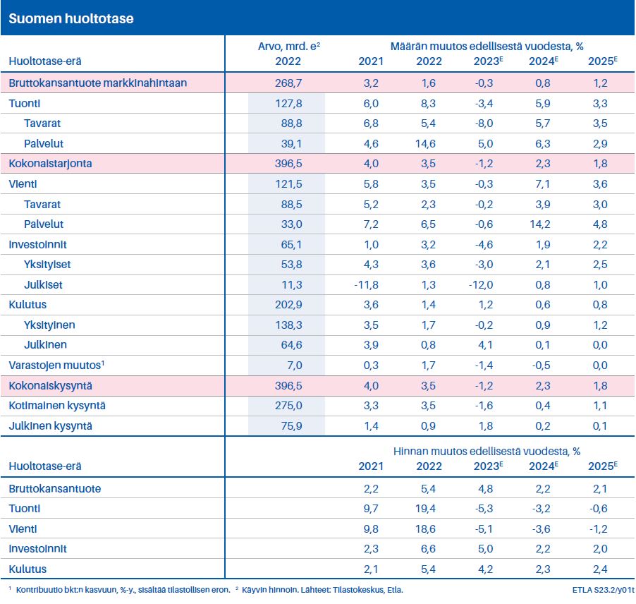 Suomen talouden näkymät eivät ole kohentuneet viime vuodesta ja Etla pitääkin ennusteensa muuttumattomana viime keväästä. Suomen talouden ennustetaan supistuvan tänä vuonna 0,3 prosenttia. Alkuvuonna bruttokansantuote vielä kasvoi mutta loppuvuotta kohden talous supistuu. Koko vuonna taloutta painavat erityisesti investoinnit ja varastojen purkaminen, mutta hieman myös yksityinen kulutus. Asuinrakentamisen suhdanne on heikentynyt nopeasti ja ripeä inflaatio on nakertanut kotitalouksien ostovoimaa. Sen sijaan julkinen kulutus kasvaa voimakkaasti. Vientiä heikentää tänä vuonna heikko kansainvälinen kysyntä. Tuonti kuitenkin vähenee vientiä enemmän, joten nettoviennin vaikutus jää positiiviseksi.