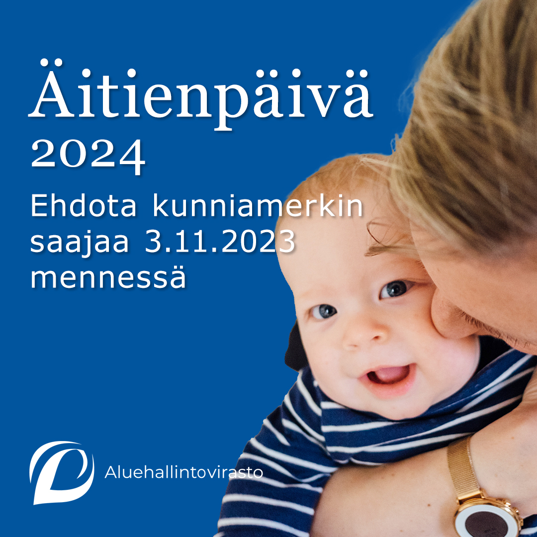 Aluehallintovirastot pyytävät 3.11.2023 mennessä esitykset toimialueiltaan vuoden 2024 äitienpäivän kunniamerkkien saajiksi. Kunniamerkin voi saada 40 vuotta täyttänyt biologinen äiti, adoptioäiti tai sijaisäiti. Lasten lukumäärällä ei ole ratkaisevaa vaikutusta palkitsemiseen. Kunnat, seurakunnat, yhdistykset ja muut yhteisöt voivat ehdottaa palkittavia äitejä. Jos omat lapset tekevät esityksiä, tulee niissä olla vähintään kaksi luotettavaa, toisistaan riippumatonta puoltavaa lausuntoa järjestöiltä tai muilta yhteisöiltä.