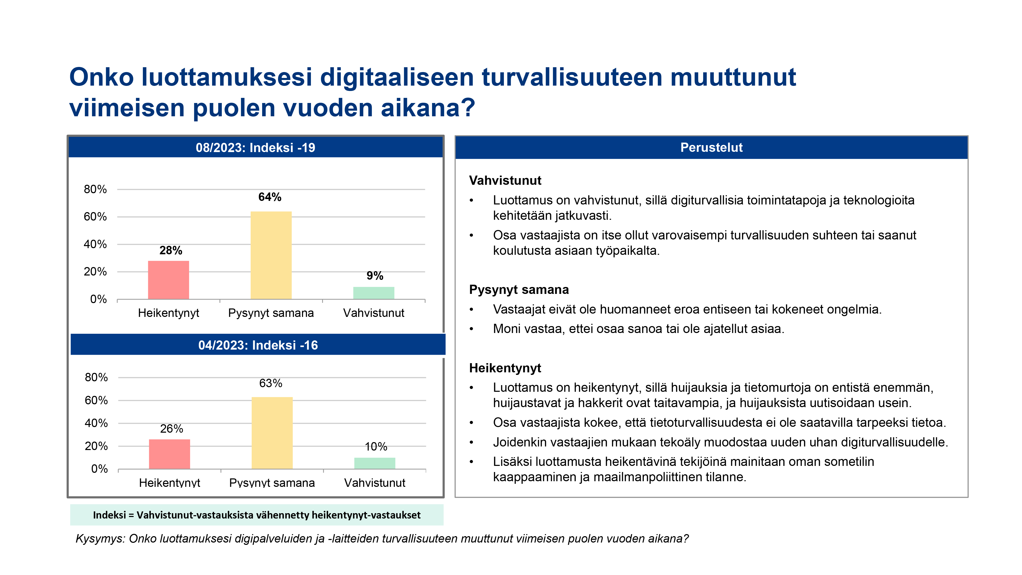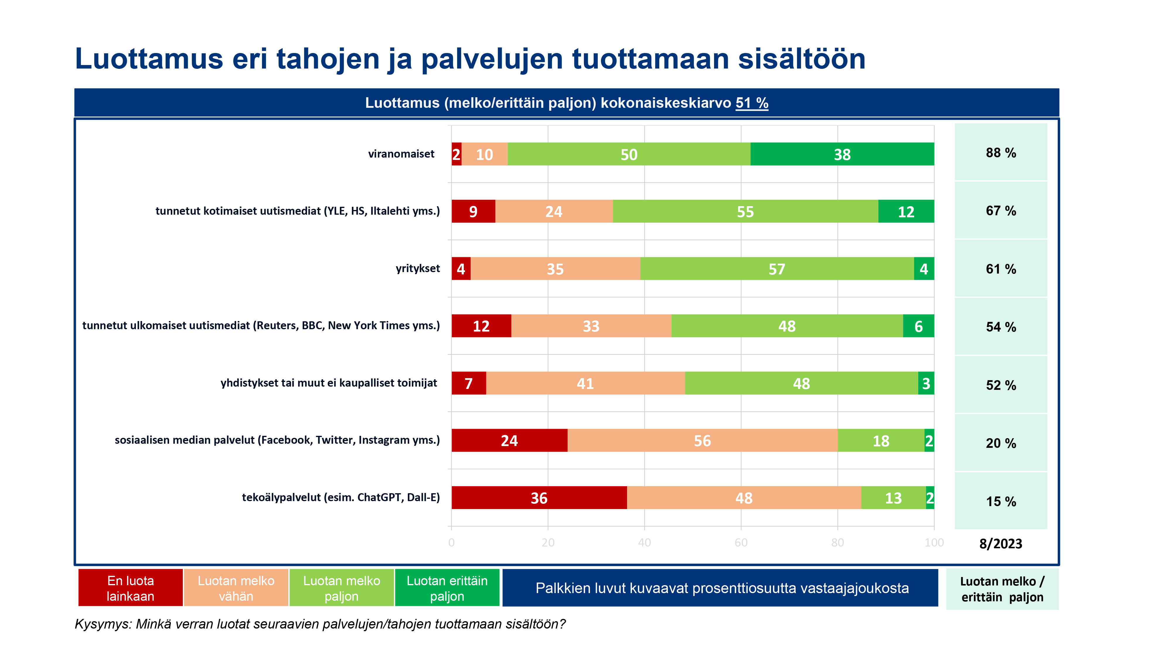 Torstaina 21.9.2023 julkaistu Digiturvabarometri selvitti kokemuksia digitaalisen turvallisuuden tilasta ja siihen liittyvistä ilmiöistä. Digi- ja väestötietoviraston kyselyyn vastasi 1 000 täysi-ikäistä suomalaista. Tulosten mukaan suomalaiset luottavat selvästi eniten viranomaisen tuottamaan sisältöön (88 %). Tunnettujen kotimaisten uutismedioiden (67 %) ja yritysten sisältöihin (61 %) paljon tai melko paljon kertoi luottavansa myös selkeä enemmistö vastaajista. Sen sijaan vain viidesosa (20 %) luottaa sisältöihin sosiaalisen median palveluissa.