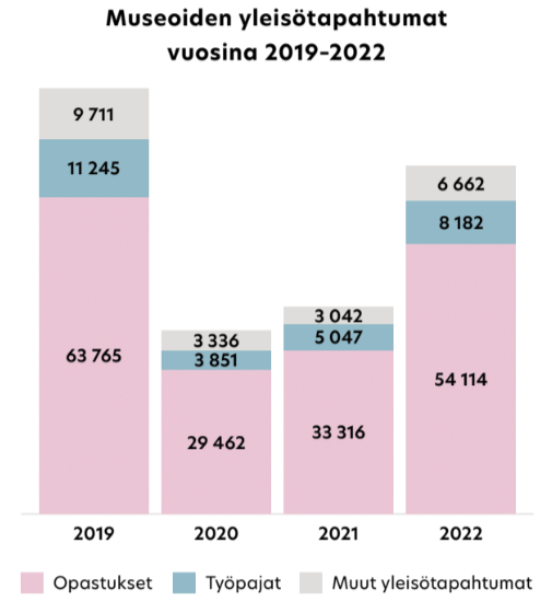 Museot järjestivät paikan päällä jälleen runsaasti erilaisia yleisötapahtumia. Sen sijaan verkossa livestriimattuja tapahtumia järjestettiin huomattavasti vähemmän kuin koronavuosina 2020 ja 2021. Museokäyntien ja yleisötyön vilkastuminen näkyy myös museoiden omissa tuloissa, jotka kasvoivat ennätyslukemiin, lähes 54,9 miljoonaan euroon. Omista tuloista pääsymaksutuloja oli 29,4 miljoonaa euroa, mikä oli jopa enemmän kuin ennen koronaa (27,9 miljoona euroa vuonna 2019).