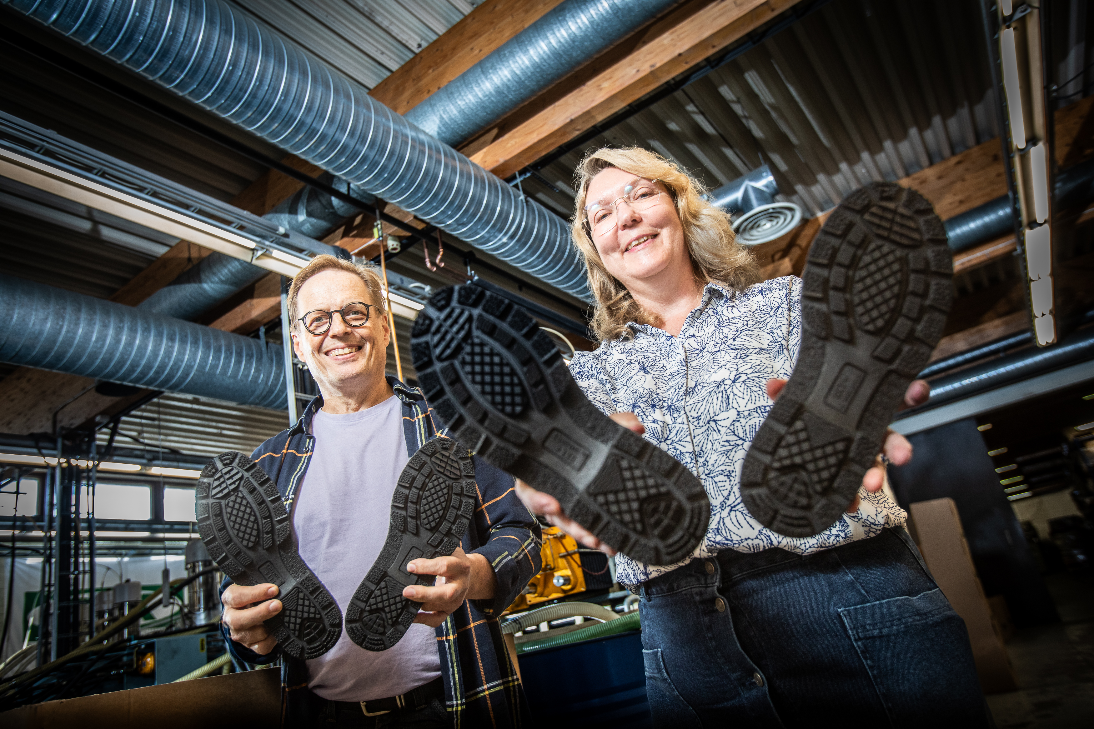 Alkuvaiheessa Lenkki Oy valmistaa uusioraaka-aineen avulla kävely- ja ulkoilukenkien pohjia. Mäkilouko myöntää, että aluksi mietitytti, miten uusioraaka-aine istuu vakiintuneisiin tuotantotapoihin.