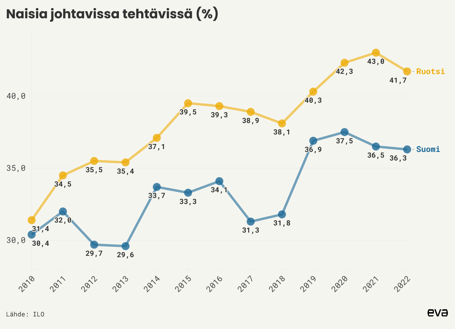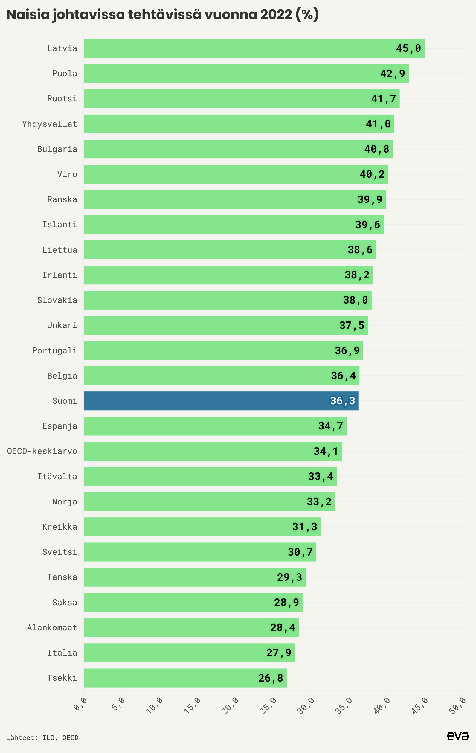 Naisten osuus kaikista johtavissa tehtävissä toimivista henkilöistä on 36,3 prosenttia Suomessa vuonna 2022, käy ilmi EVAn päivitetystä Lasikattomittarista. Suomessa on enemmän naisia johtavissa tehtävissä kuin OECD-maissa keskimäärin. Naisjohtajien osuus Suomessa on pienentynyt viime vuosina.
