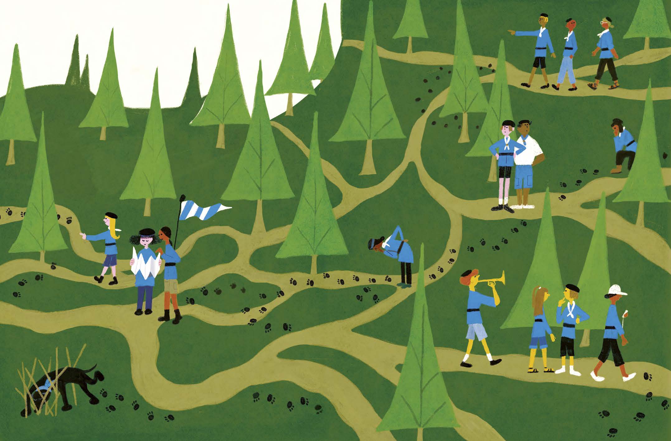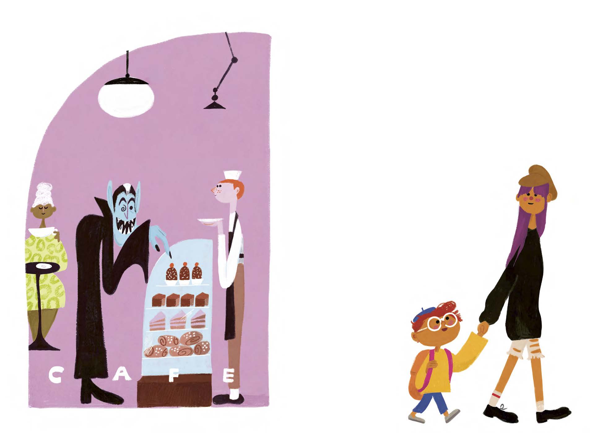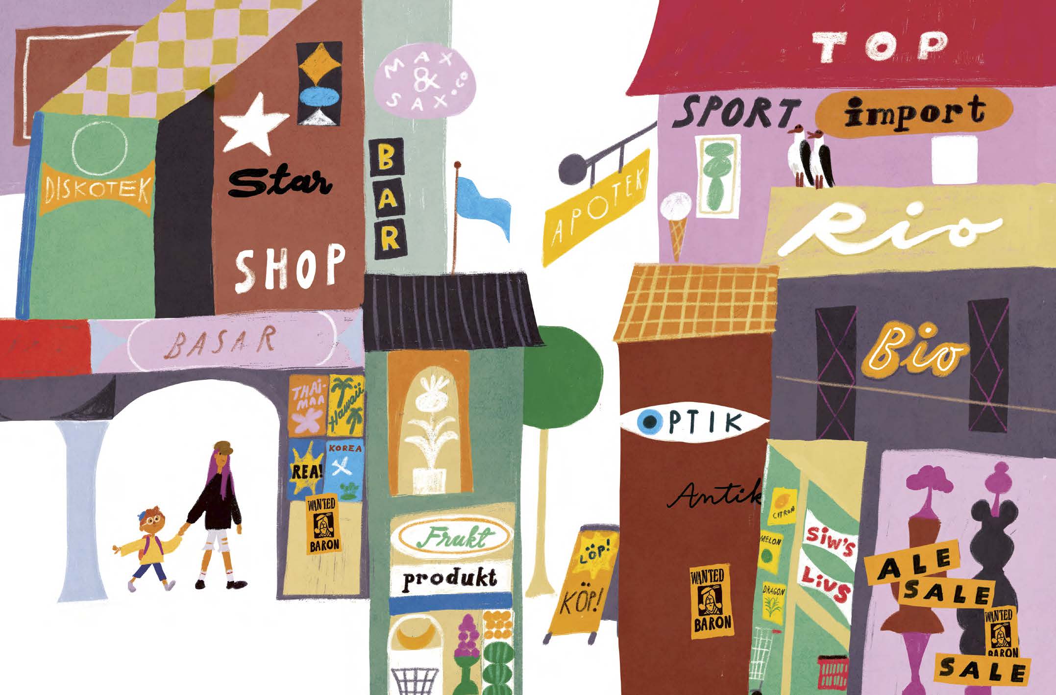 Sanna Mander illustrerar lekfullt stadsmiljön med allt från yra vampyrer på café till en senior labrador som leder en hel scoutkår på villospår. När syskonen till slut når hemmet har skolväskan glömts kvar någonstans i stadsbilden. Kanske du kan hitta den?