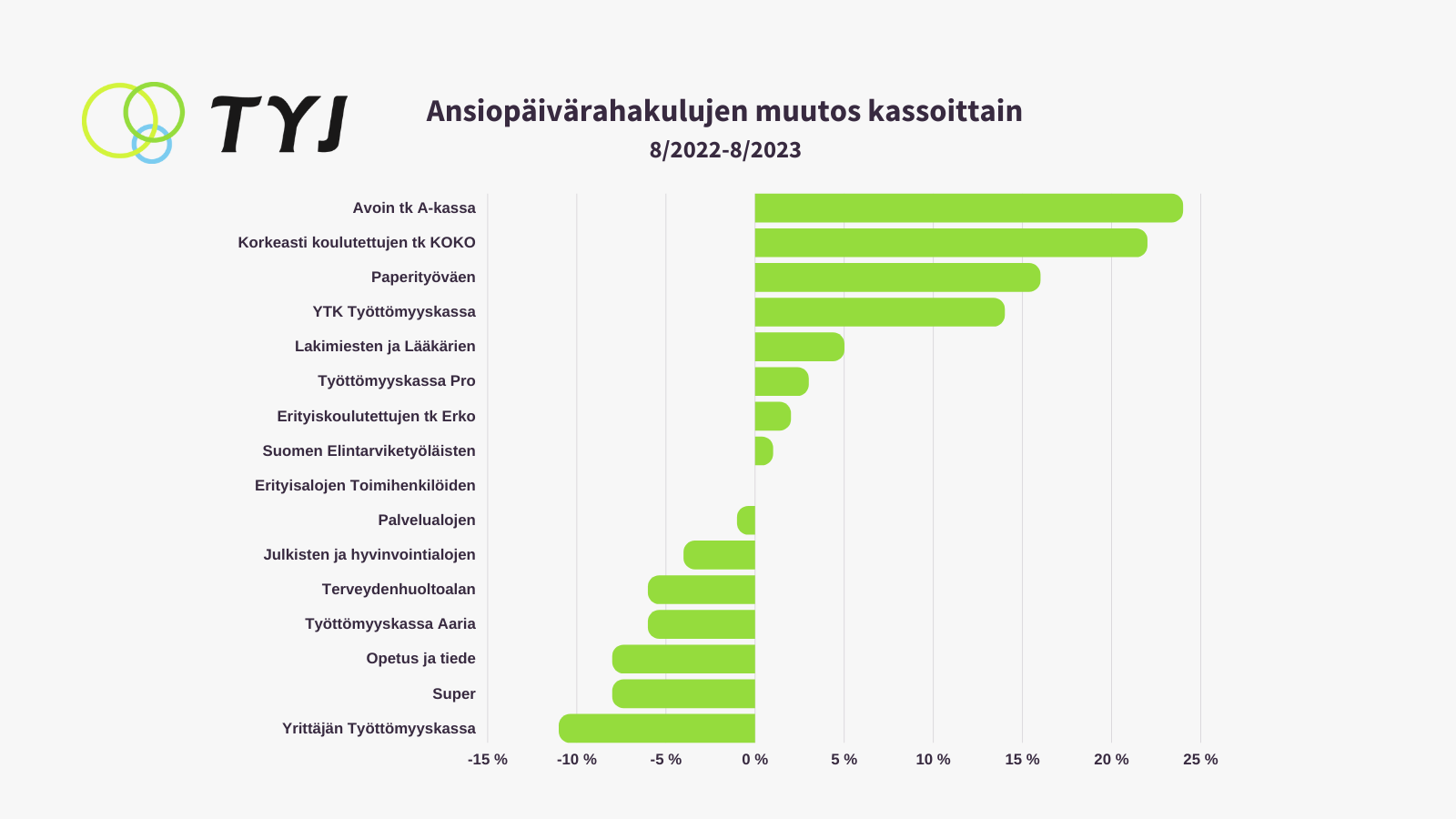 Ansiopäivärahakulut kasvoivat kahdeksassa työttömyyskassassa, mikä vastaa puolta Suomen työttömyyskassoista. Prosentuaalisesti muutos viime vuoden elokuuhun nähden oli suurin Avoimessa työttömyyskassassa, Korkeakoulutettujen työttömyyskassa KOKOssa ja Paperityöväen Työttömyyskassassa. Euromääräisesti kulut kasvoivat eniten YTK Työttömyyskassassa. ”Lisääntyneet lomautukset kasvattavat erityisesti teollisuusalojen kassojen kuluja. Työttömyyden kasvu ei kuitenkaan rajoitu teollisuuteen. Päivärahakulut laskevat tällä hetkellä lähinnä hoito- ja opetusalojen kassoissa sekä yrittäjien kassassa”, TYJ:n toiminnanjohtaja Aki Villman sanoo.