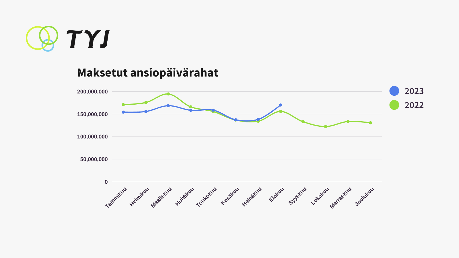 | Maksetut ansiopäivärahat | 170 milj. | + 9 % | 156 milj. |