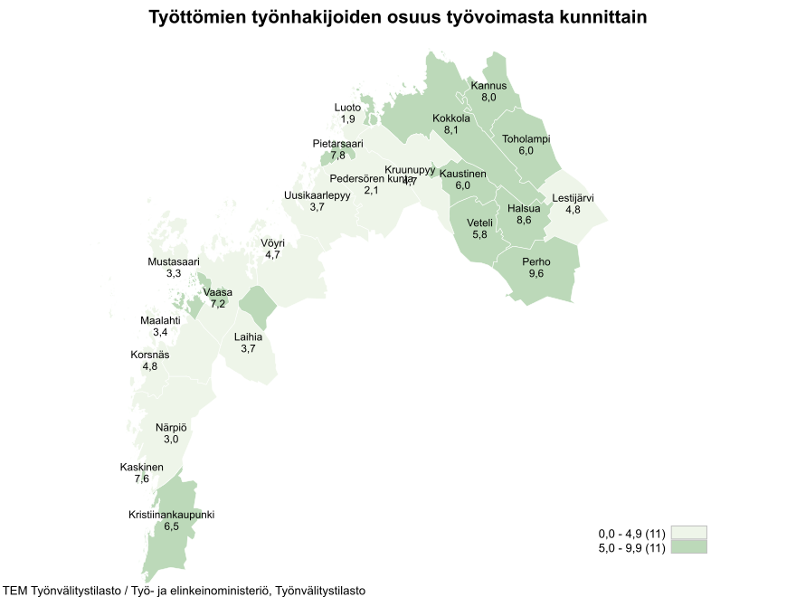 Työttömien työnhakijoiden määrä kasvoi kaikissa Pohjanmaan ELY-keskuksen seutukunnissa vuoden takaiseen verrattuna. Työttömien määrä kasvoi Vaasan seudulla 140 henkilöllä (+ 5 %), Suupohjan rannikkoseudulla 35 henkilöllä (+ 11 %), Pietarsaaren seudulla 168 henkilöllä (+ 18 %), Kokkolan seutukunnassa 157 henkilöllä (+ 9 %) ja Kaustisen seutukunnassa 9 henkilöllä (+ 2 %). Pohjanmaan ELY-keskusalueen seutukunnista alhaisin työttömyysaste oli Suupohjan rannikkoseudulla, 4,5 %. Eniten työttömiä työnhakijoita oli Vaasan seudulla, 3065 työtöntä työnhakijaa.