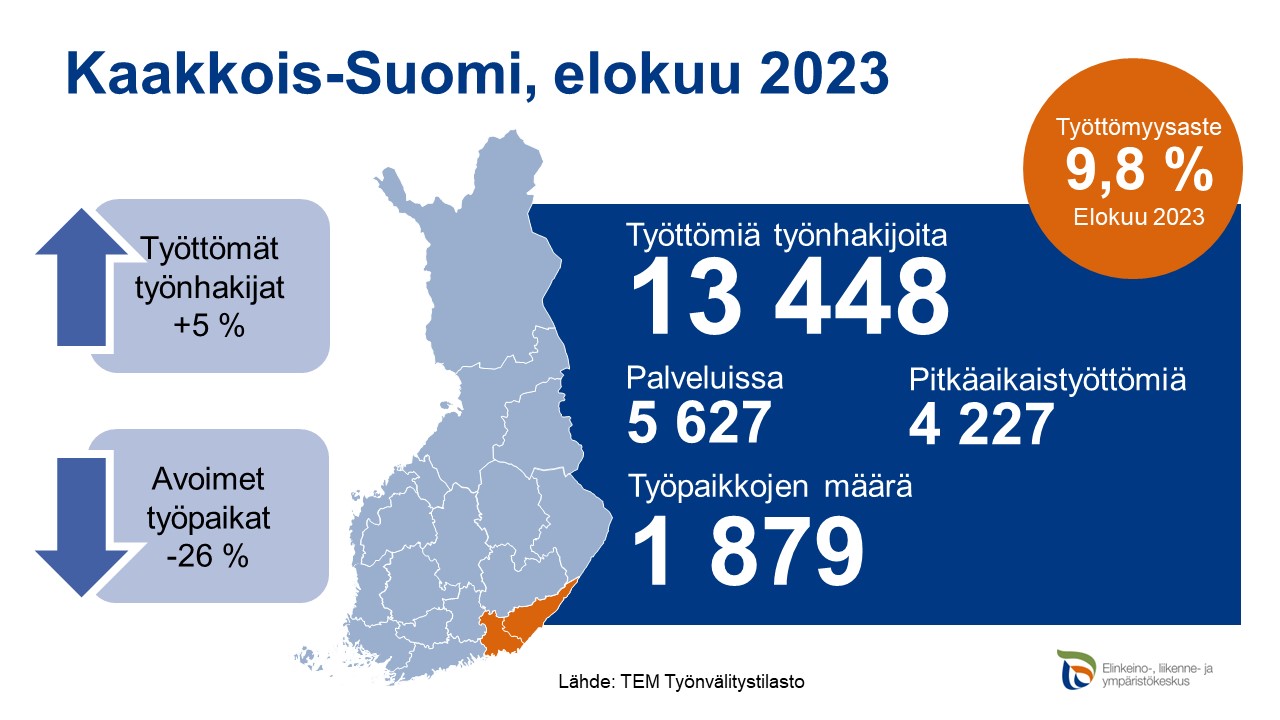 Kaakkois-Suomen työ- ja elinkeinotoimistossa oli elokuun 2023 lopussa 13448 työtöntä työnhakijaa. Työttömiä oli viisi prosenttia enemmän kuin vuosi sitten. Lomautettujen määrä kasvoi vuodentakaisesta reilusti. Myös nuorten työttömien ja pitkäaikaistyöttömien määrät kasvoivat. Ulkomaalaisia työttömiä oli vuodentakaiseen verrattuna 10 prosenttia enemmän. Uusia avoimia työpaikkoja oli elokuun aikana avoinna 1879, mikä on 26 prosenttia vähemmän kuin vuosi sitten. Vaikka työttömyyden kehitys vuodentakaiseen verrattuna on monilta osin heikompi, ovat kokonaistyöttömyysluvut elokuisen mittaushistorian toiseksi matalimmat.