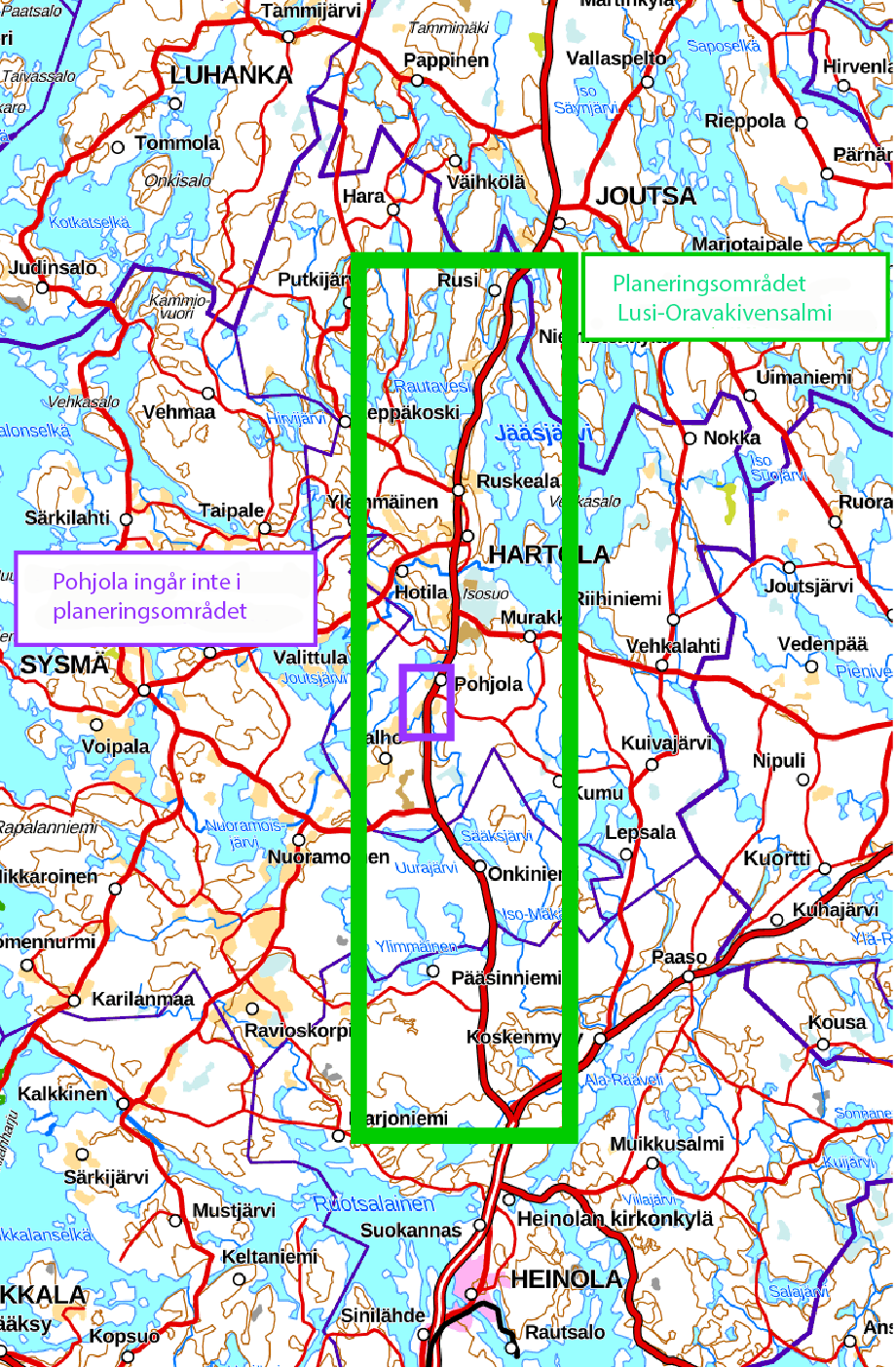 Planeringsområdet täcker ett cirka 50 kilometer långt avsnitt av riksväg 4. Pohjola och Ahveslampi i södra delen av Hartola ingår inte i denna plan, eftersom man där överväger alternativ för att förbättra vägen på den nya sträckningen.