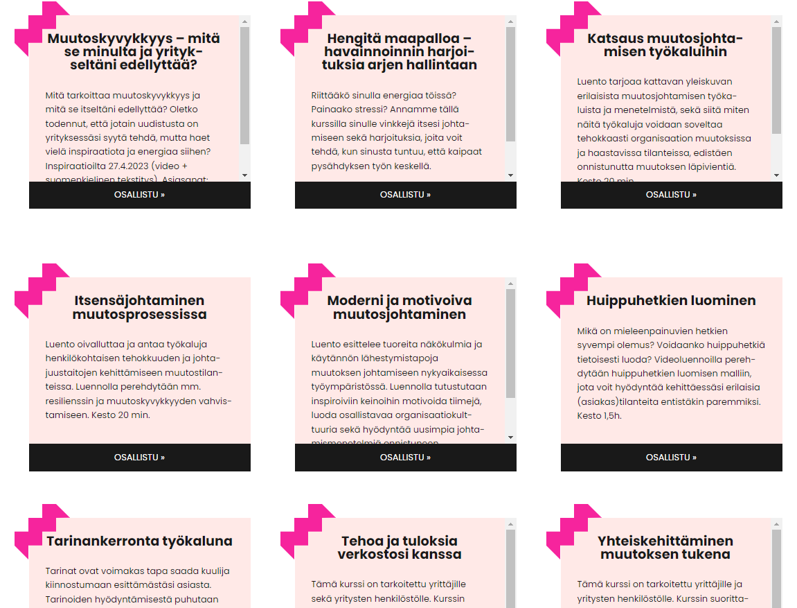 Kokonaisuuden mikro-opinnot on jaettu helposti hallittaviin osiin, joten opiskella voi lyhyinäkin vapaahetkinä, esimeriksi kahvitauolla. Lisäksi tarjolla on perinteisiä opintoja niille, jotka haluavat syventyä aiheisiin perusteellisemmin. Opintotarjonta on koottu teemoittain sivustolle yritystenmuutoskumppanina.fi. Sivusto kokoaa yhteen erilaisia sisältöjä sekä tuo näkymän niin ammattikorkeakoulujen kuin Yrittäjät-akatemian koulutustarjontaan. Tavoitteena on, että yritysten henkilöstö pääsee mahdollisimman ketterästi tutustumaan tarjolla oleviin maksuttomiin sisältöihin.