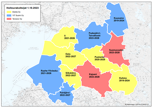 Kilpailutusten myötä alkavien maanteiden hoitourakoiden urakoitsijat vaihtuvat Pudasjärvi-Taivalkosken ja Suomussalmen urakoissa. Pudasjärvi-Taivalkosken urakoitsijana aloittaa YIT Suomi Oy ja Suomussalmella Terranor Oy. Kajaanin urakassa jatkaa aiemminkin urakkaa hoitanut Terranor Oy. Alueurakoitsijat aloittavat viisivuotisen toimikautensa lokakuun alusta.