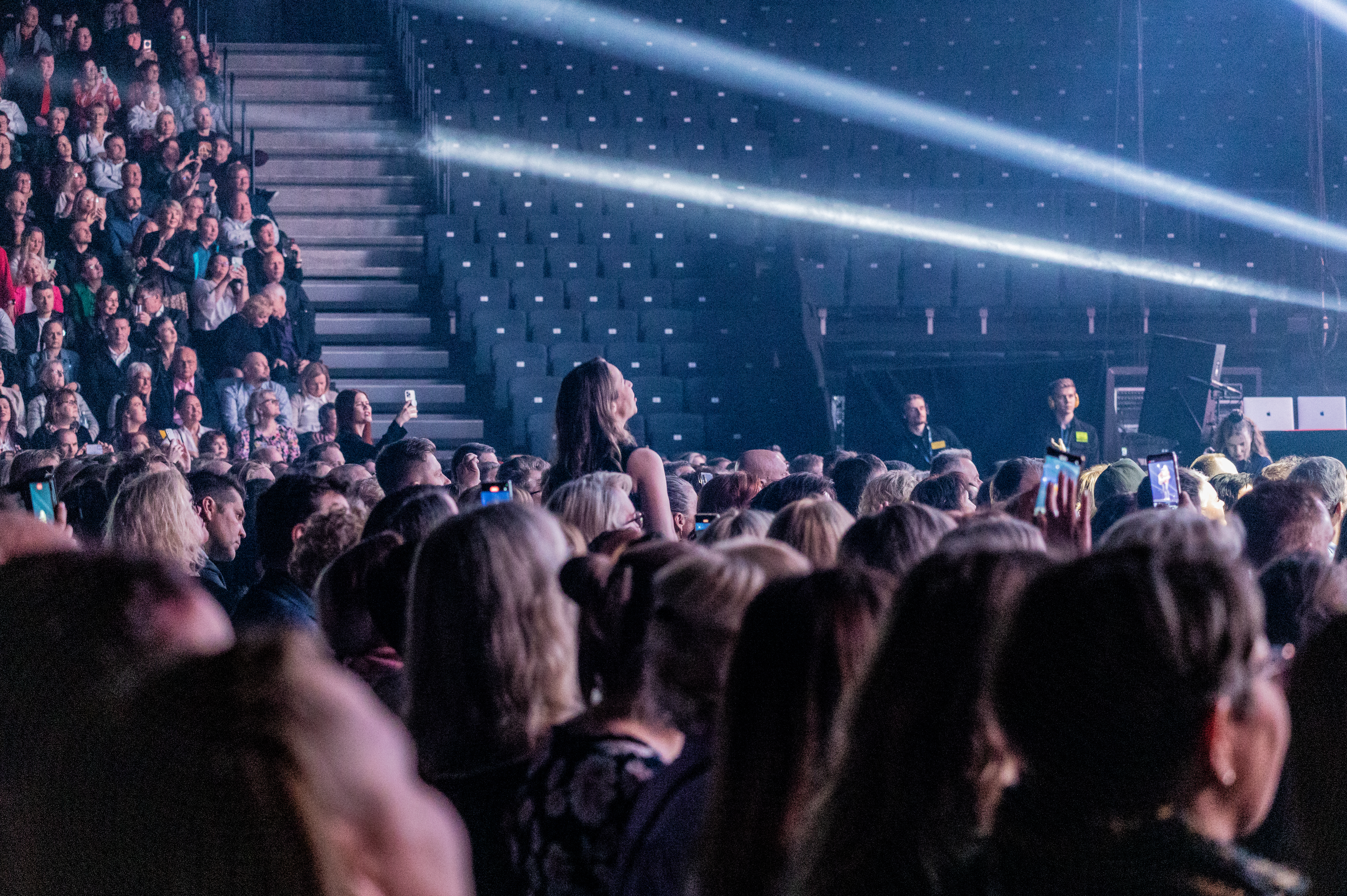 - Kokonaisvaltainen näköala areenalle yläkatsomosta lavaa vastapäätä