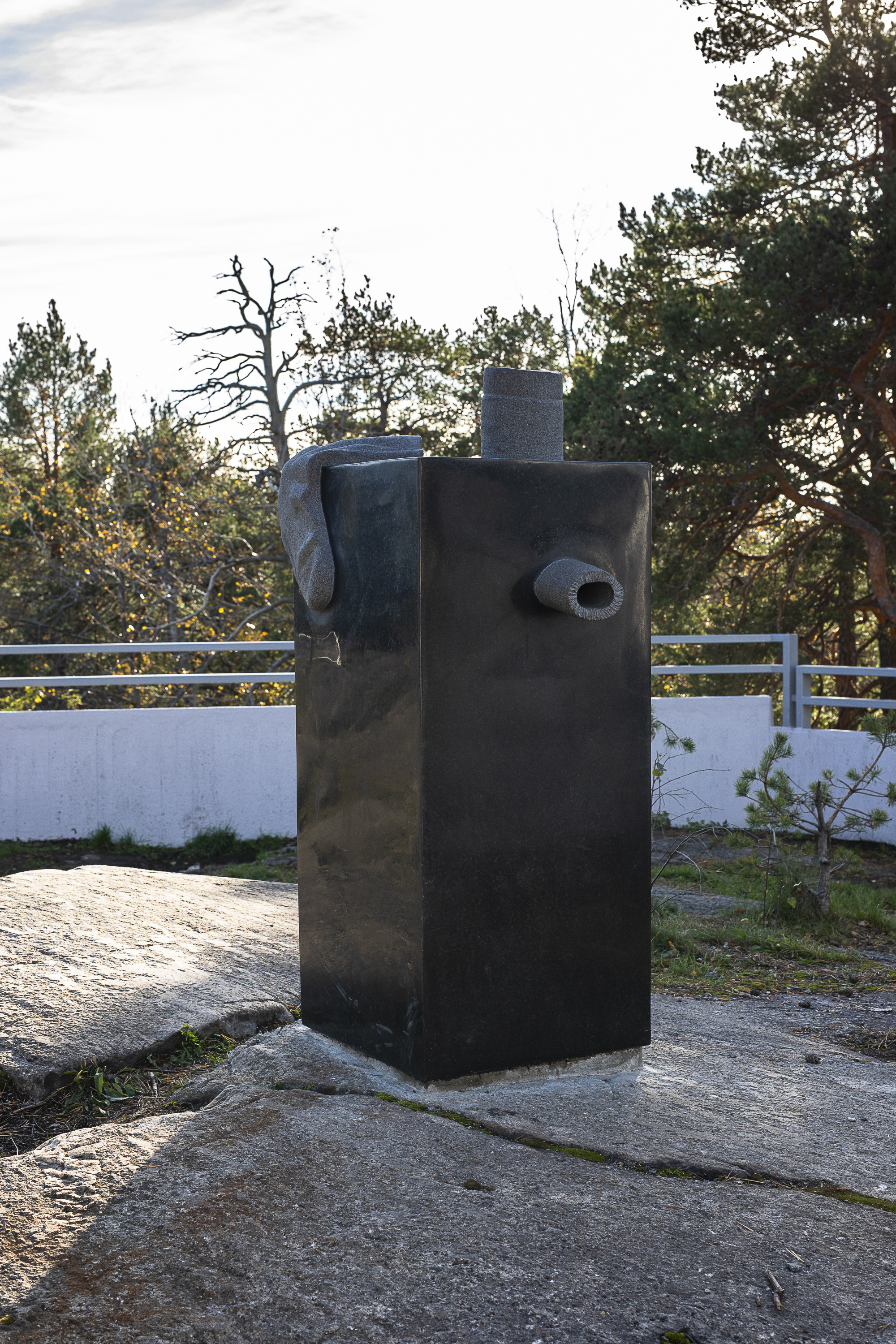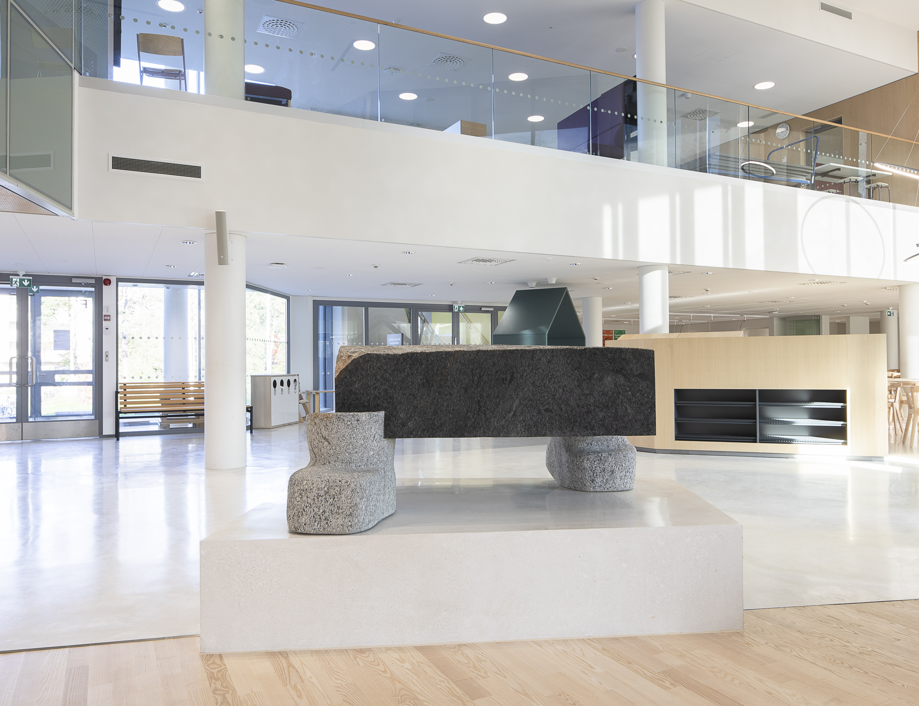 Sisätiloihin sijoitettu Luonto liikkuu, on saappaiden päälle tassuttelemaan nostettu kappale pintakalliota, joka on louhittu koulun pihalta uudisrakennusosan alta. Veistos on tästä yhdestä kappaleesta veistetty ja nyt tuotu rakennukseen sisälle. Ulkoveistos Ihminen luonnossa puolestaan seisoo pihakallion päällä. Se on veistetty yhdestä kivestä, kappaleesta Varpaisjärven mustaa diabaasia. Perusmuodoltaan se muistuttaa veistosjalustaa tai rakennuspalikkaa, jonka yhdellä kulmalla roikkuu ikään kuin kuivumaan nostettu märkä sukka sekä varvasosastaan ratkennut villasukka, jalustaan uponneena ja siitä edelleen ulostulevana, sadeveden voidessa juosta sen läpi.