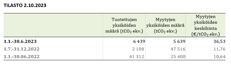 Vuoden 2023 alkupuoliskolla Suomen vapaaehtoisilla hiilimarkkinoilla myytyjen yksiköiden keskihinta oli yli kolminkertainen, mutta tuotettujen ja myytyjen yksiköiden määrä oli selvästi vuoden takaista pienempi.