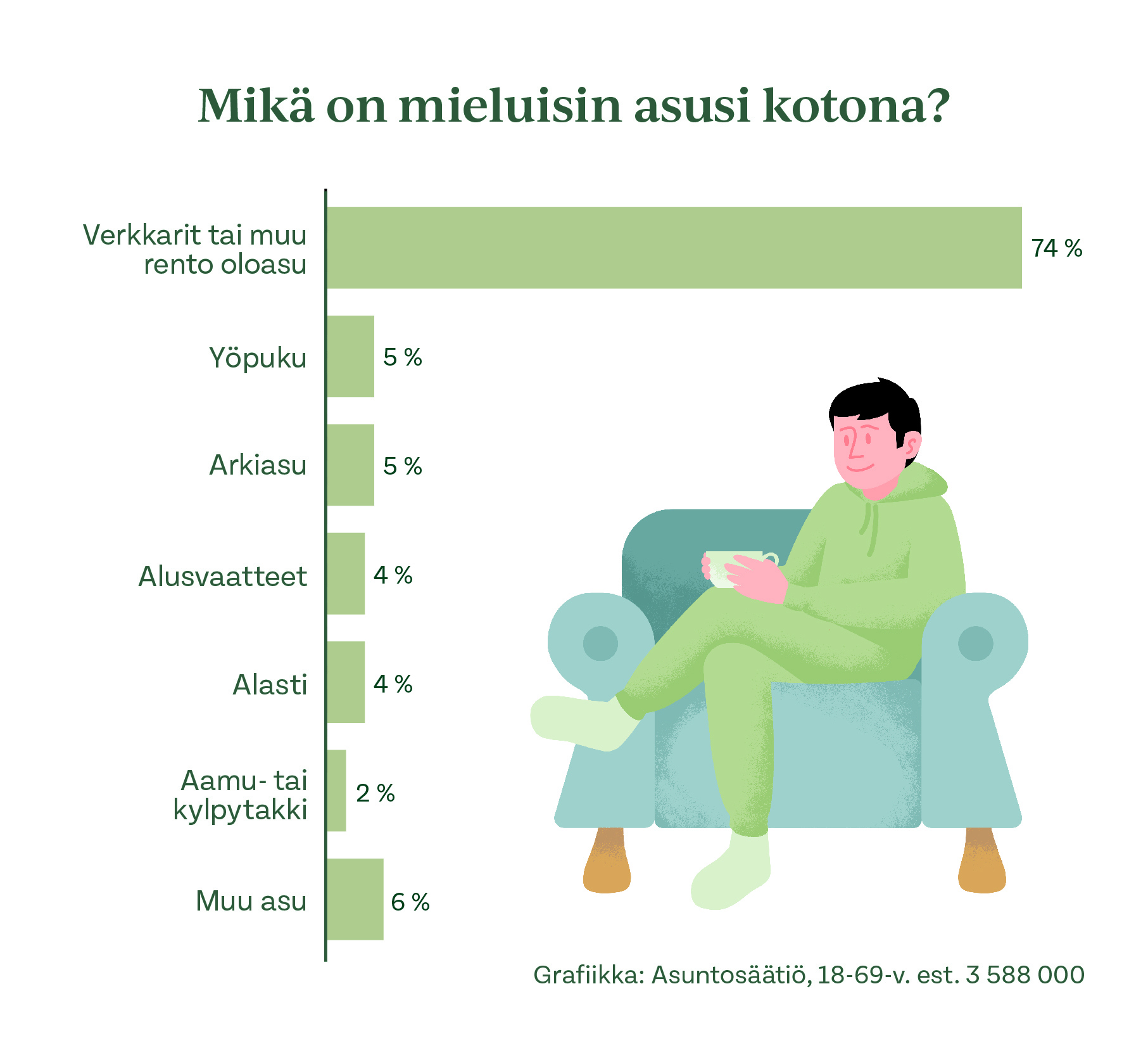 ”Tutkimuksemme mukaan koti on meille toiseksi tärkein onnellisuuden lähde terveyden jälkeen. Koti on paikka, jossa turvallisuus, oma rauha ja rentoutuminen ovat tärkeintä. Suosituin kotiasumme heijasteleekin näitä asioita – meillä ei kotoilla epämukavissa vaatteissa tai kengät jalassa, vaan juuri itselle mukavimmassa asussa”, Asuntosäätiön viestintäjohtaja Johanna Otranen sanoo.