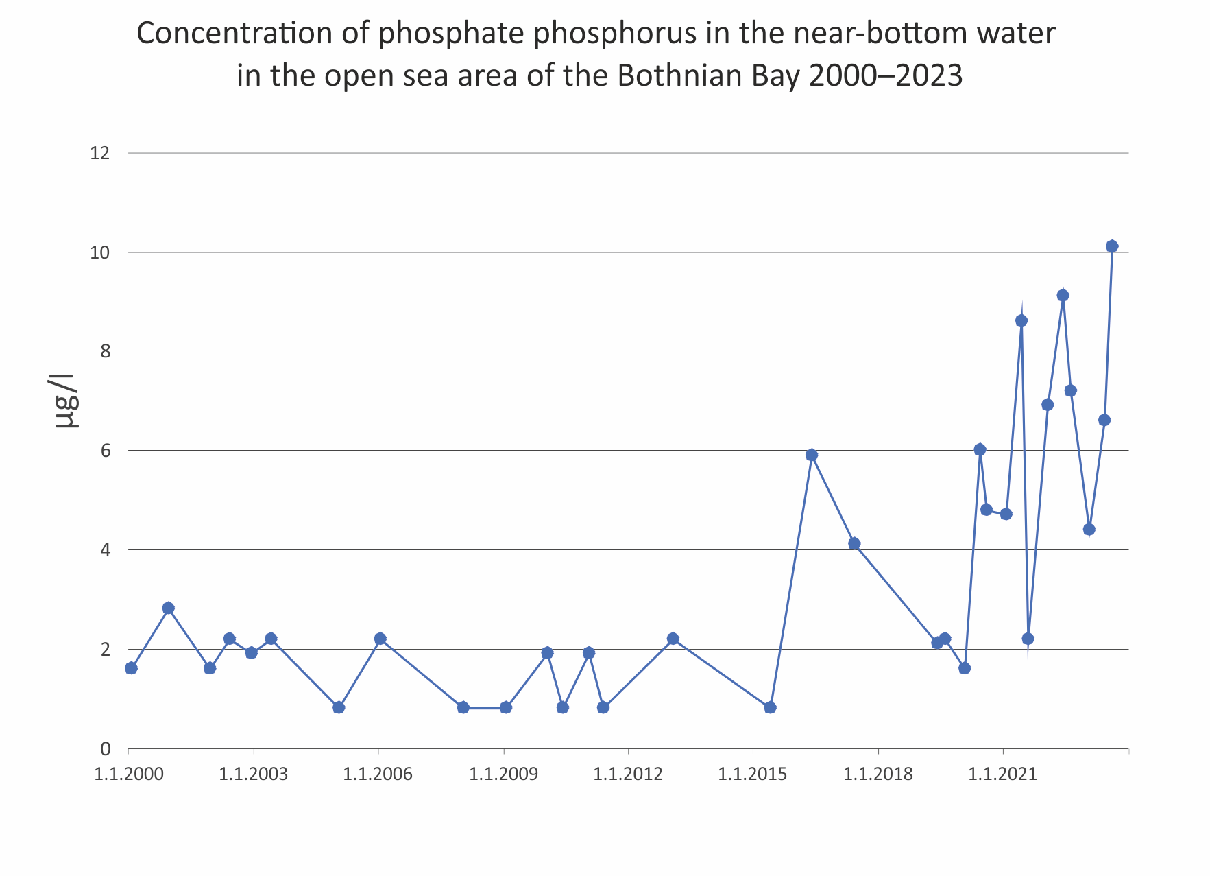 The content of phosphate phosphorus in areas near the bottom in the open sea of the Bothnian Bay has continued to increase. © Finnish Environment Institute