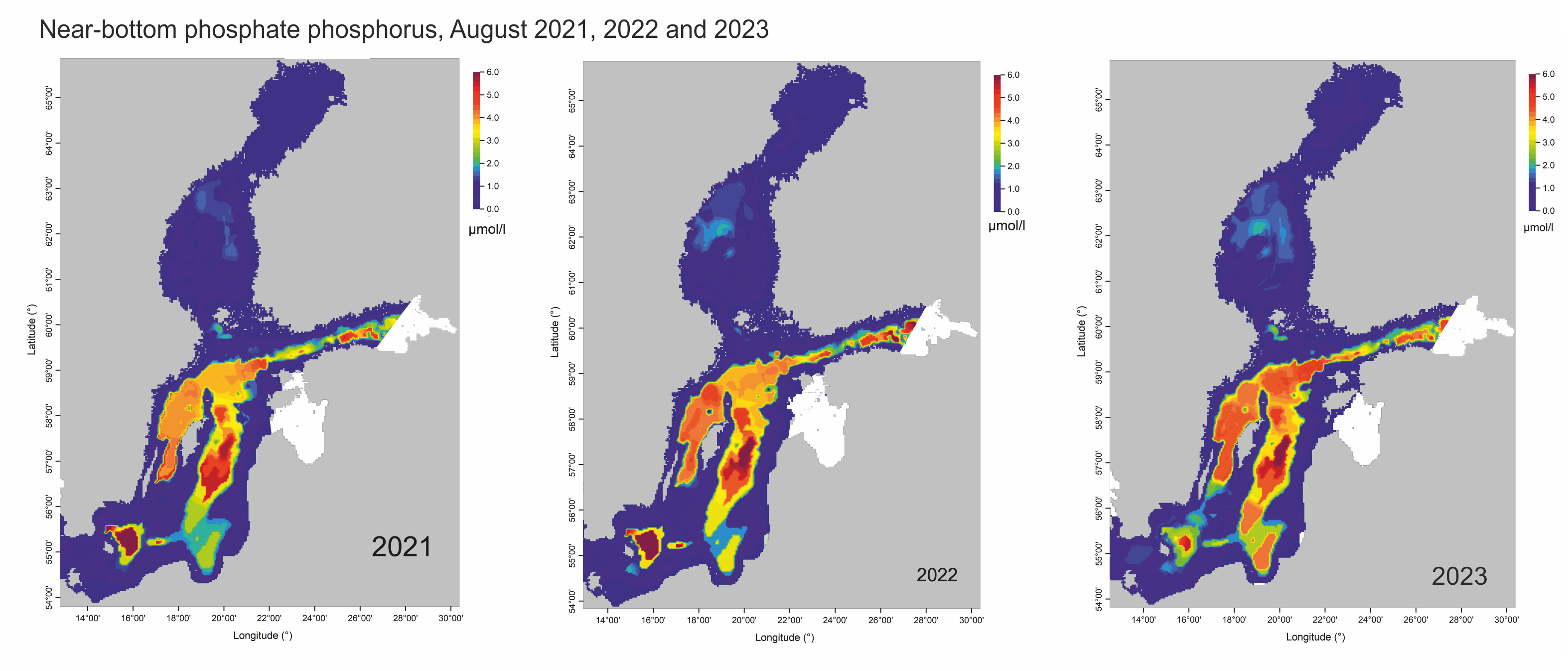 Phosphate phosphorus concentrations on the seafloor in the open sea from the southern Baltic Sea to the Bay of Bothnia in August 2021, 2022 and 2023.