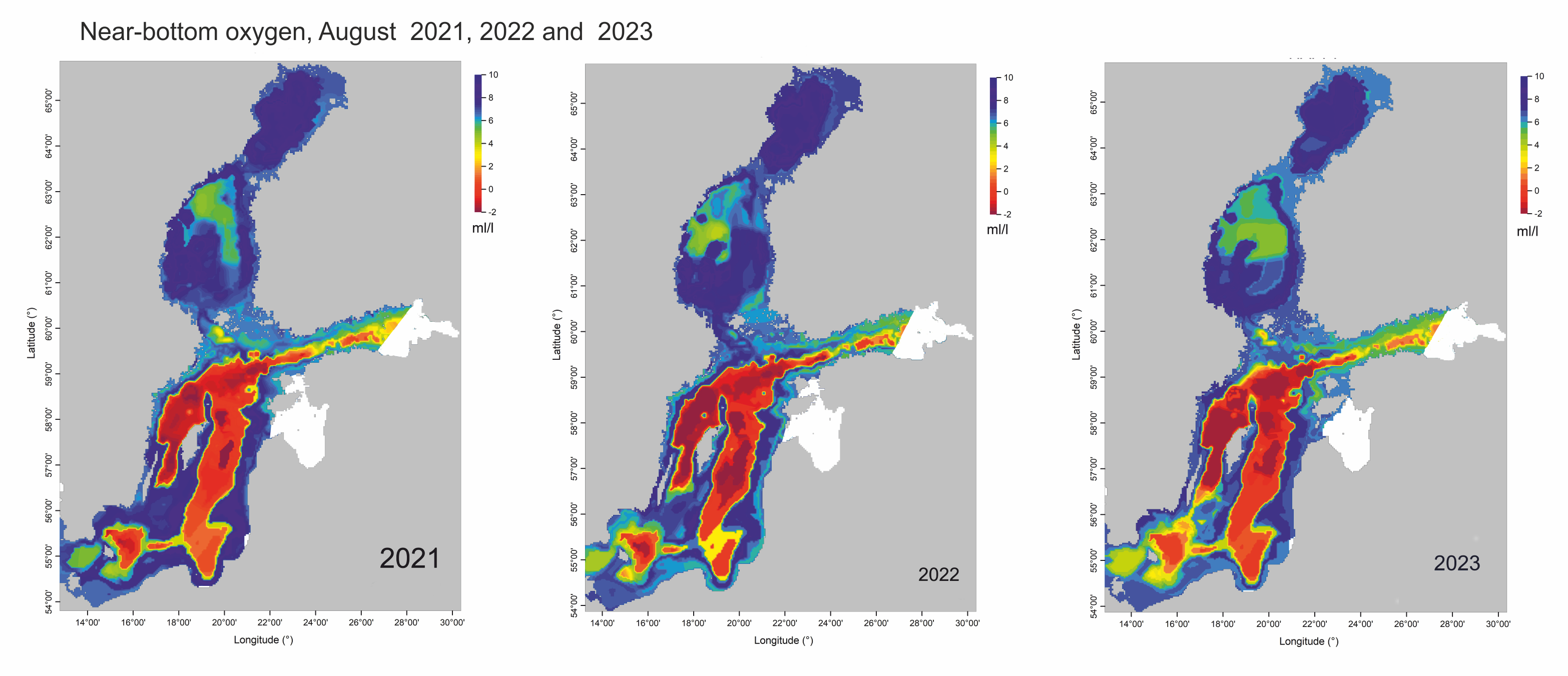 Oxygen situation near the seabed in the open sea from the southern Baltic Sea to the Bay of Bothnia in August 2021, 2022 and 2023.