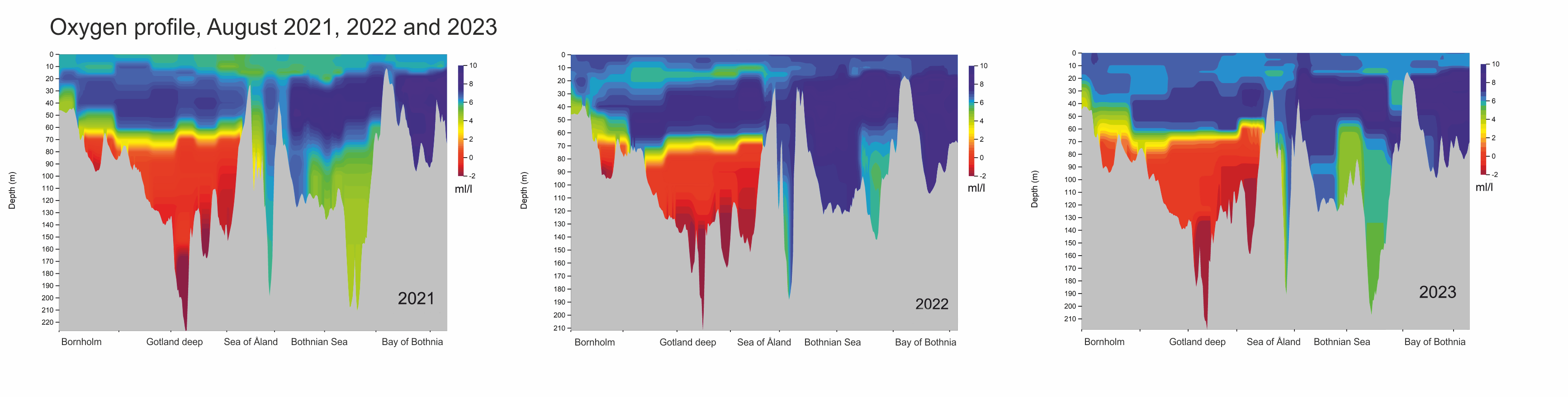 Oxygen profile from the southern Baltic Sea to the Bay of Bothnia in August 2021, 2022 and 2023.